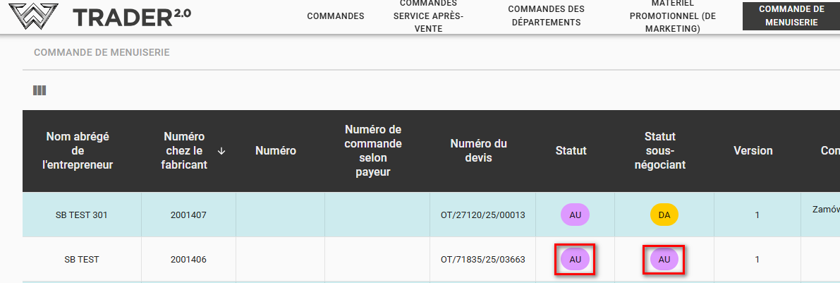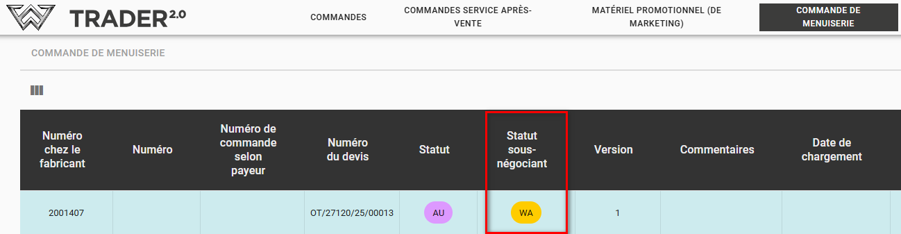Les commandes de filiales dans l'onglet Commandes de menuiserie sont résolues différemment des commandes standard. Le point clé est la nouvelle colonne disponible dans le format « STATUT SOUS-NÉGOCIANT » ET l'entrée dans la colonne des remarques (dans le champ des remarques, le négociant principal a toujours un indice que la commande a été générée par un sous-négociant).