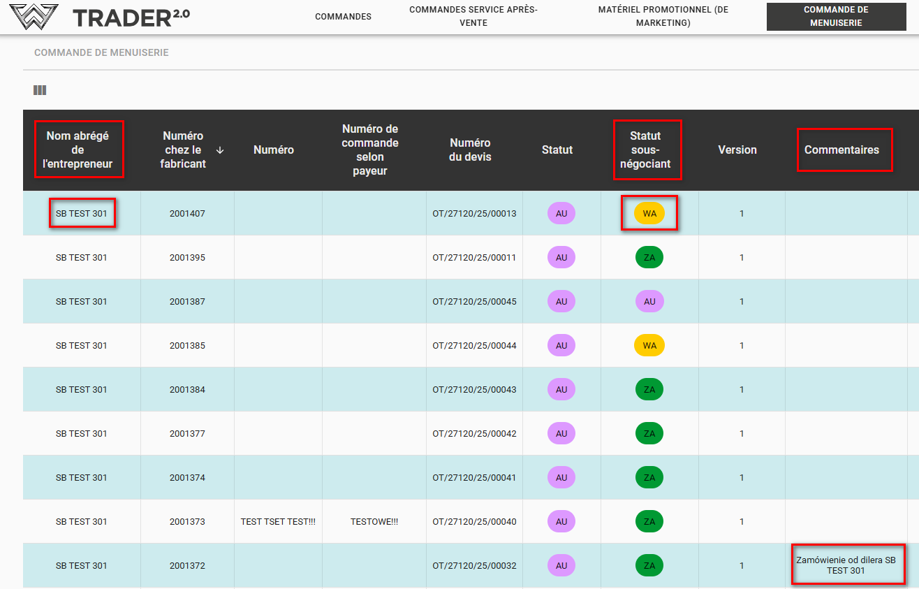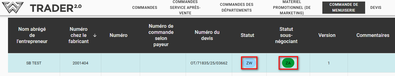 Dans l'onglet « Commandes de menuiserie », apparaîtra une nouvelle commande de notre sous-négociant, identifiable par le champ « Commentaires » et par le champ « Statut - Sous - Sous - négociant = DA (A accepter) ».)