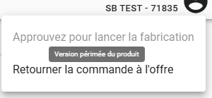 Si au moment où vous essayez d'approuver la commande pour la production, le champ est inactif, un message apparaîtra sur cette action vous informant qu'il y a une position sur la commande avec une version périmée du produit et qu'il est nécessaire de retourner la commande à l'offre. Procédez ensuite de la même manière que pour la mise à jour de la version du produit dans le devis.