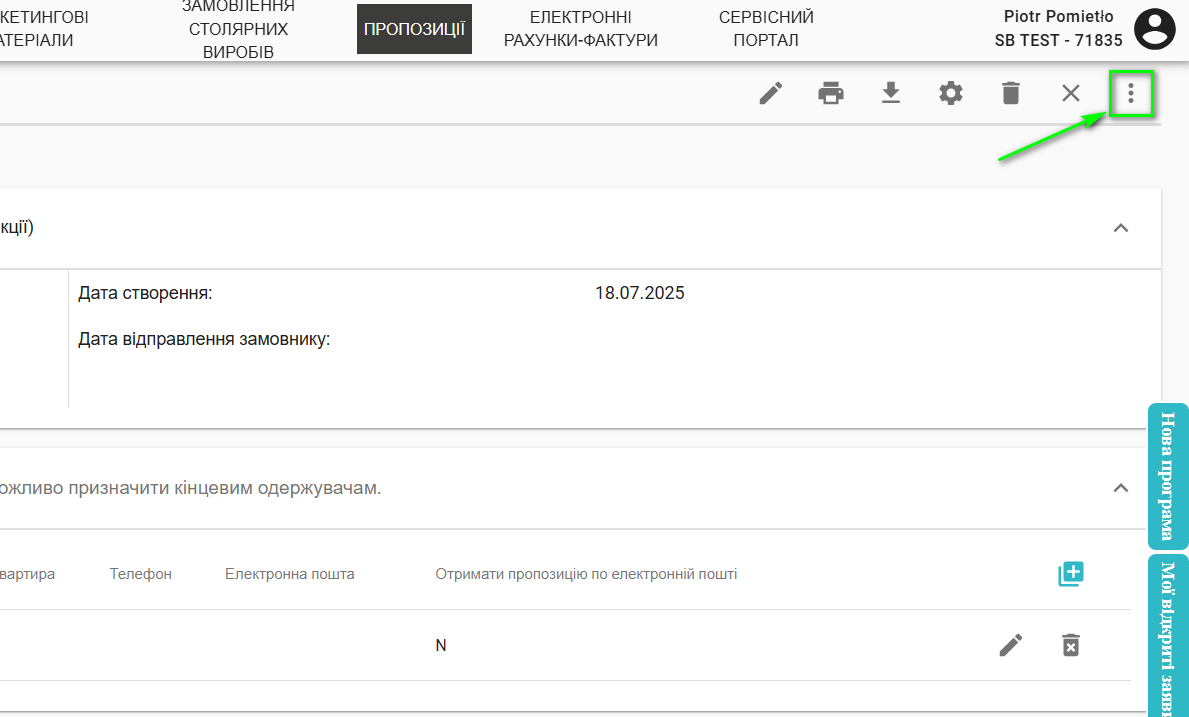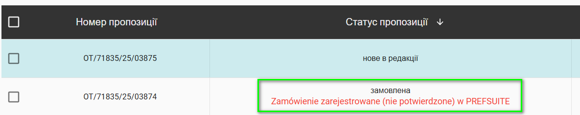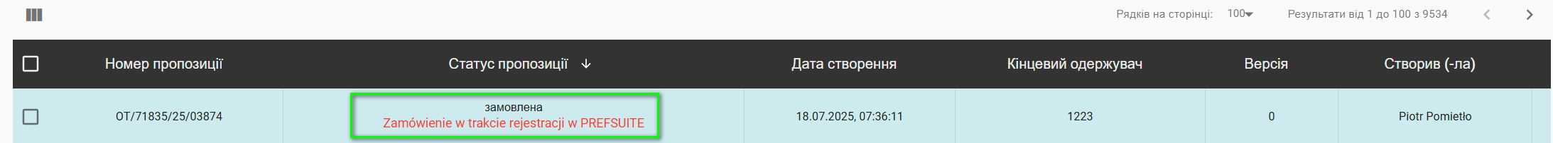 Після цього у вкладці «Пропозиції» біля створеного документа з’явиться статус – «Замовлення в процесі реєстрації» в PrefSuite.