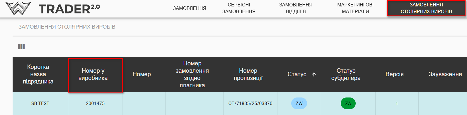 Червоний – номер замовлення Trader2.0 (у колонці «Номер у виробника»). До квітня – видно лише в полі «Nr. Ser.» (рожевий)