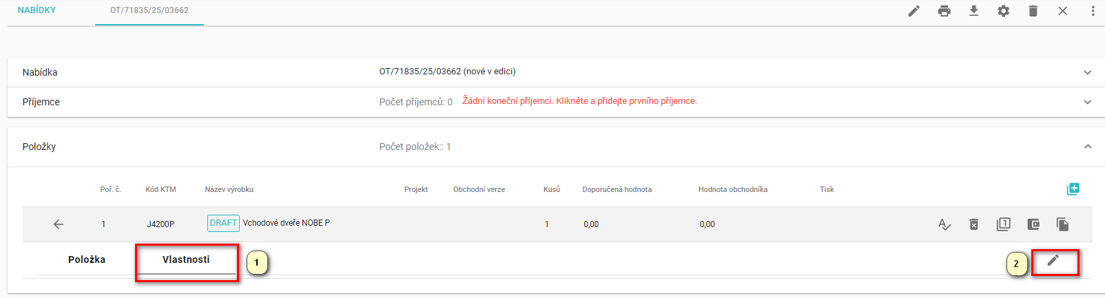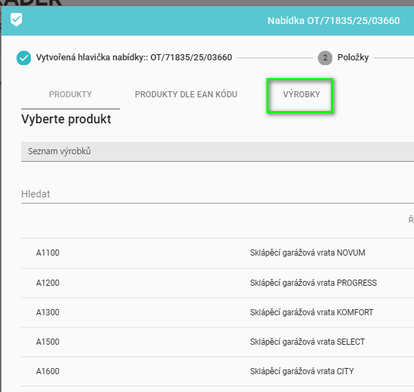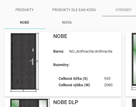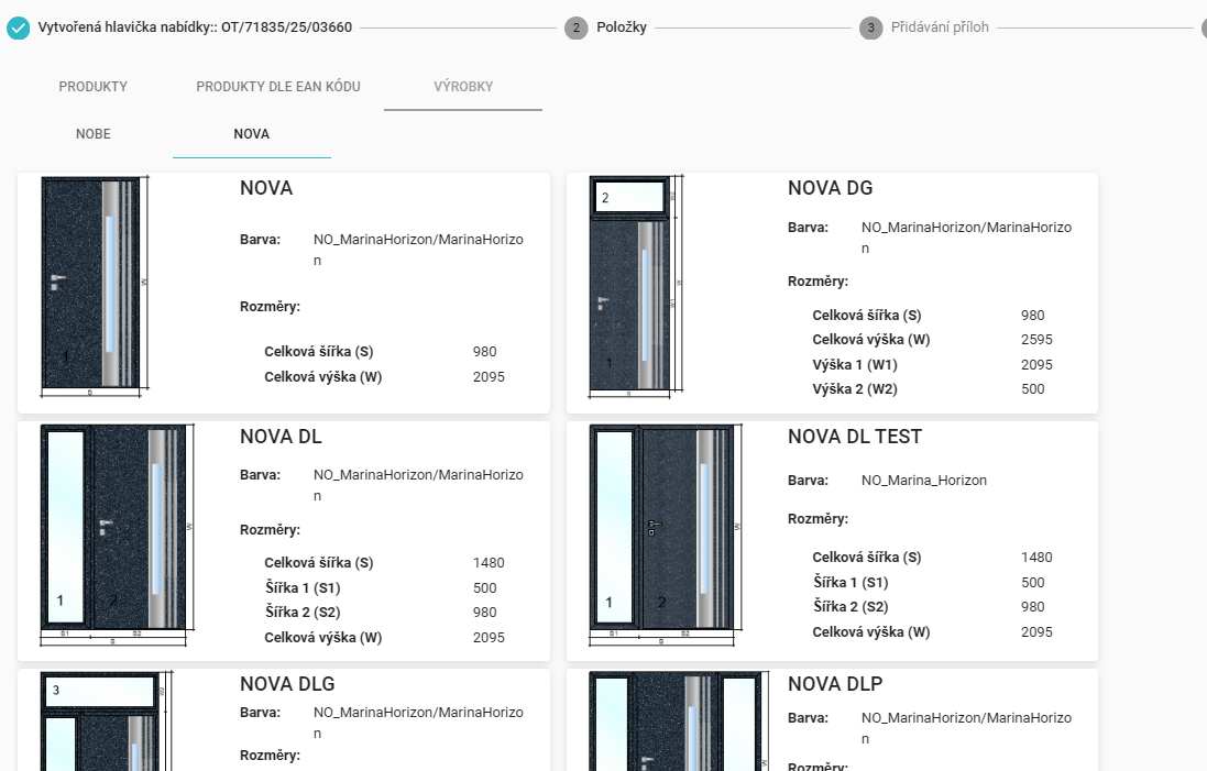 Během přípravy nabídky ve fázi výběru produktu přejděte do záložky „Výrobky“. Věnujte prosím zvláštní pozornost tomu, že v případě naceňování dveří NOVA a NOBE je nutné vždy zahájit proces vytváření cenové nabídky od vytvoření samotné nabídky. Z technických důvodů není možné zahájit naceňování přímo prostřednictvím objednávky.
