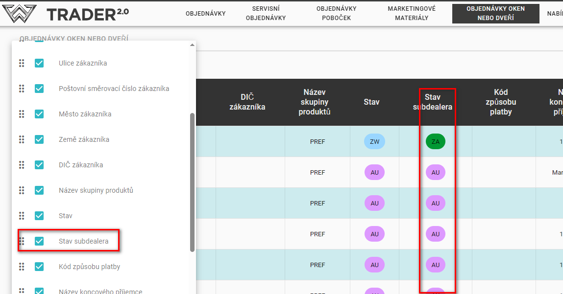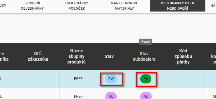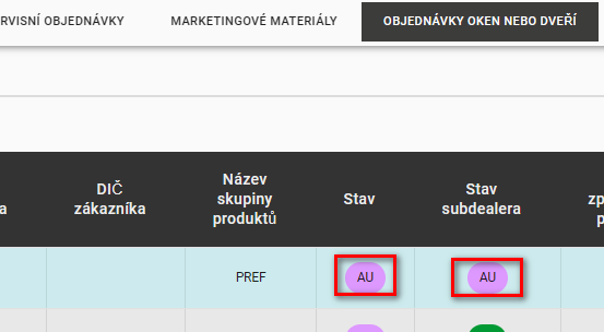 Objednávky poboček v záložce „Objednávky oken nebo dveří” jsou řešeny jinak než v u standardních objednávek. Klíčový je nový sloupec dostupný ve formátu „Stav PODDILER” a také záznam ve sloupci Poznámky (v poli poznámky má hlavní dealer vždy uvedenou nápovědu, že objednávka byla vytvořena subdealerem).