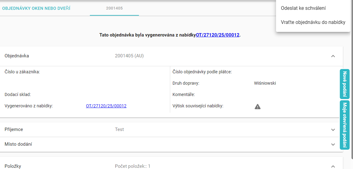 1) Po vytvoření nabídky v souladu s požadavky z I. Bodu přejdeme na záložku „objednávky oken a dveří” a u příslušné objednávky uvidíme následující akce.
