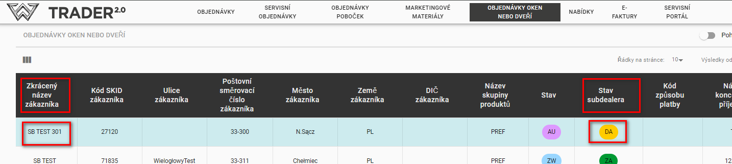 V záložce Objednávky oken nebo dveří se zobrazí nová objednávka našeho subdealera – identifikaci takové objednávky lze provést dle sloupce Poznámky nebo Status -Sub-Sub dealer = DA (ke schválení).