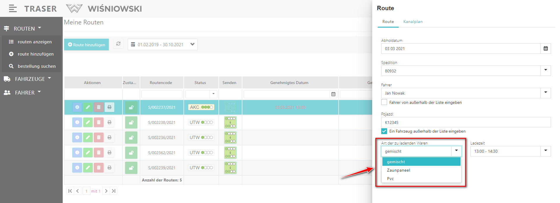 Podczas zakładania/edycji Trasy (zobacz: DE - 02. Erstellen einer neuen Route) musisz wybrać jaki typ towaru chcesz odebrać (Rys.1.). Do wyboru są następujące typy: