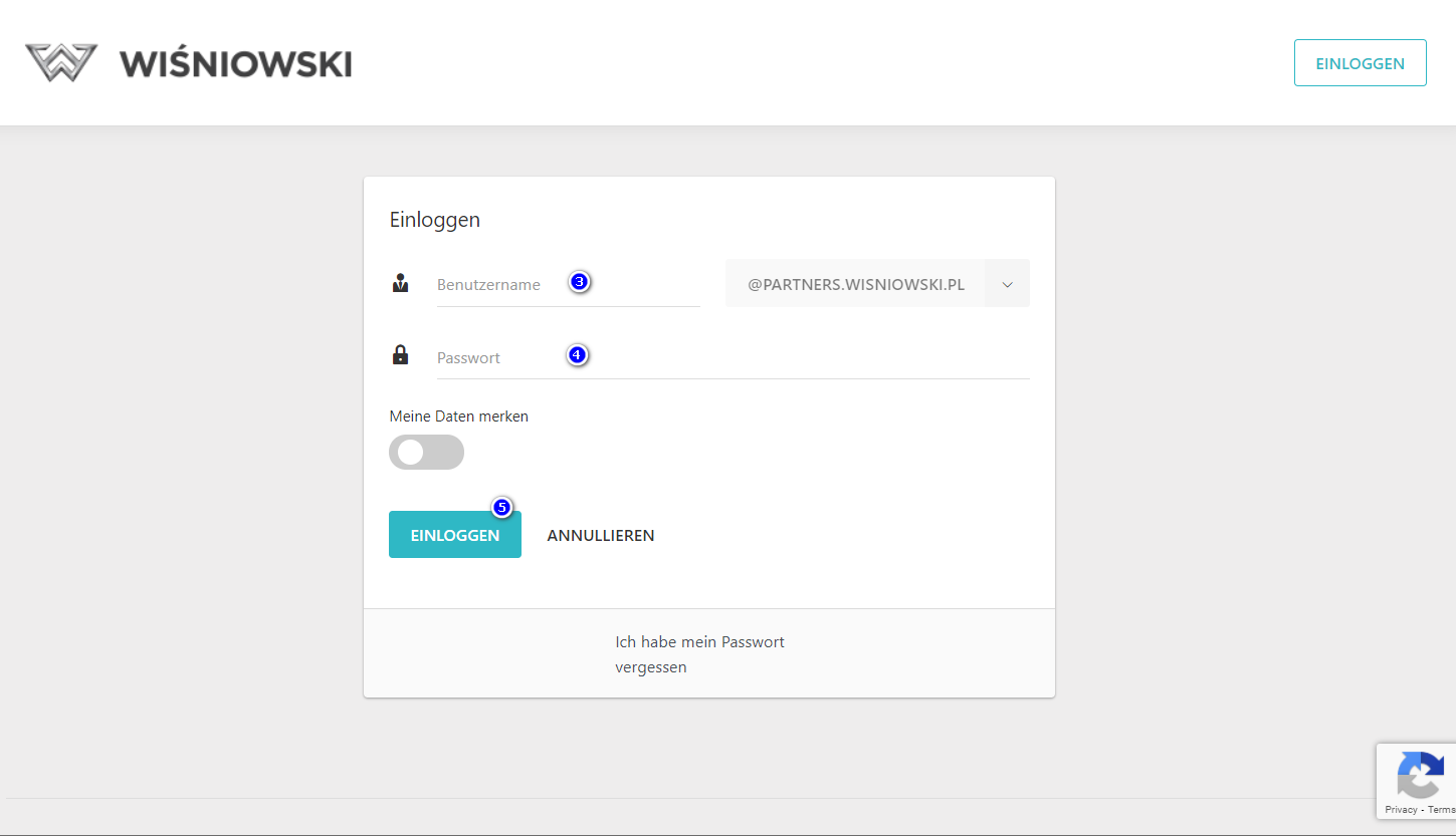 Geben Sie die Anmeldedaten des Benutzers (3), Passwort(4) ein, nd klicken Sie dann auf EINLOGGEN (5)
