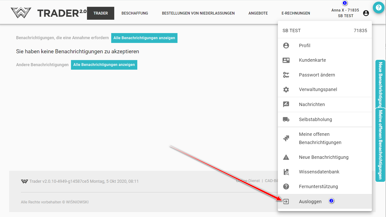 Um sich aus der Applikation abzumelden, klicken Sie auf den Benutzernamen (1) und wählen dann Ausloggen (2).