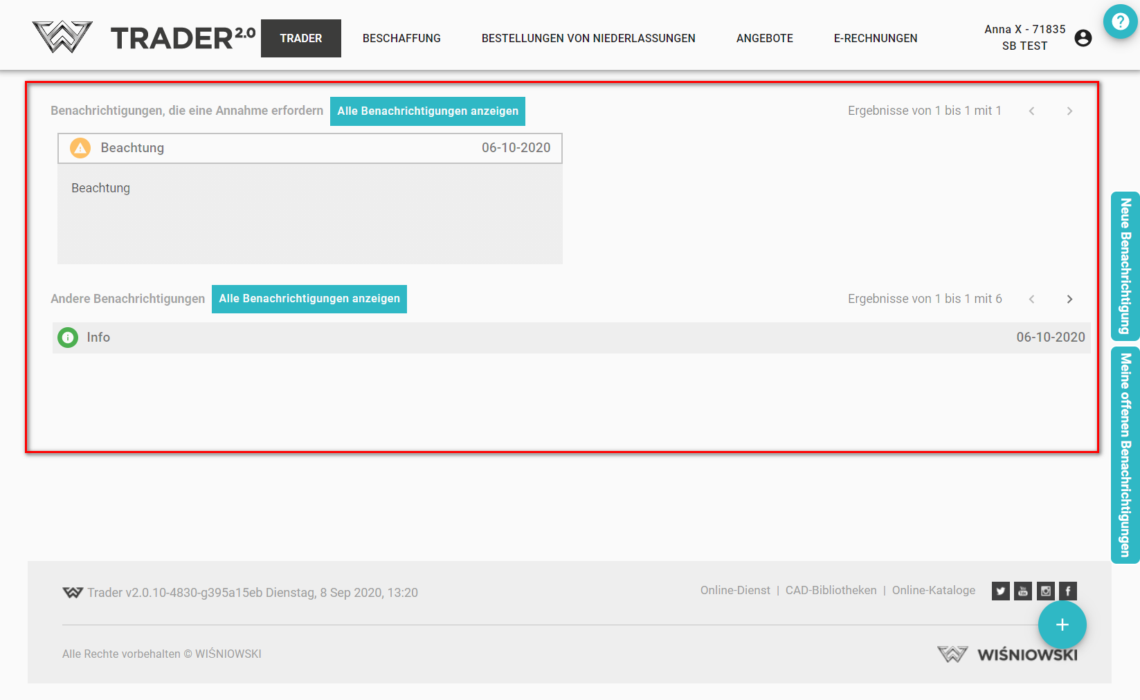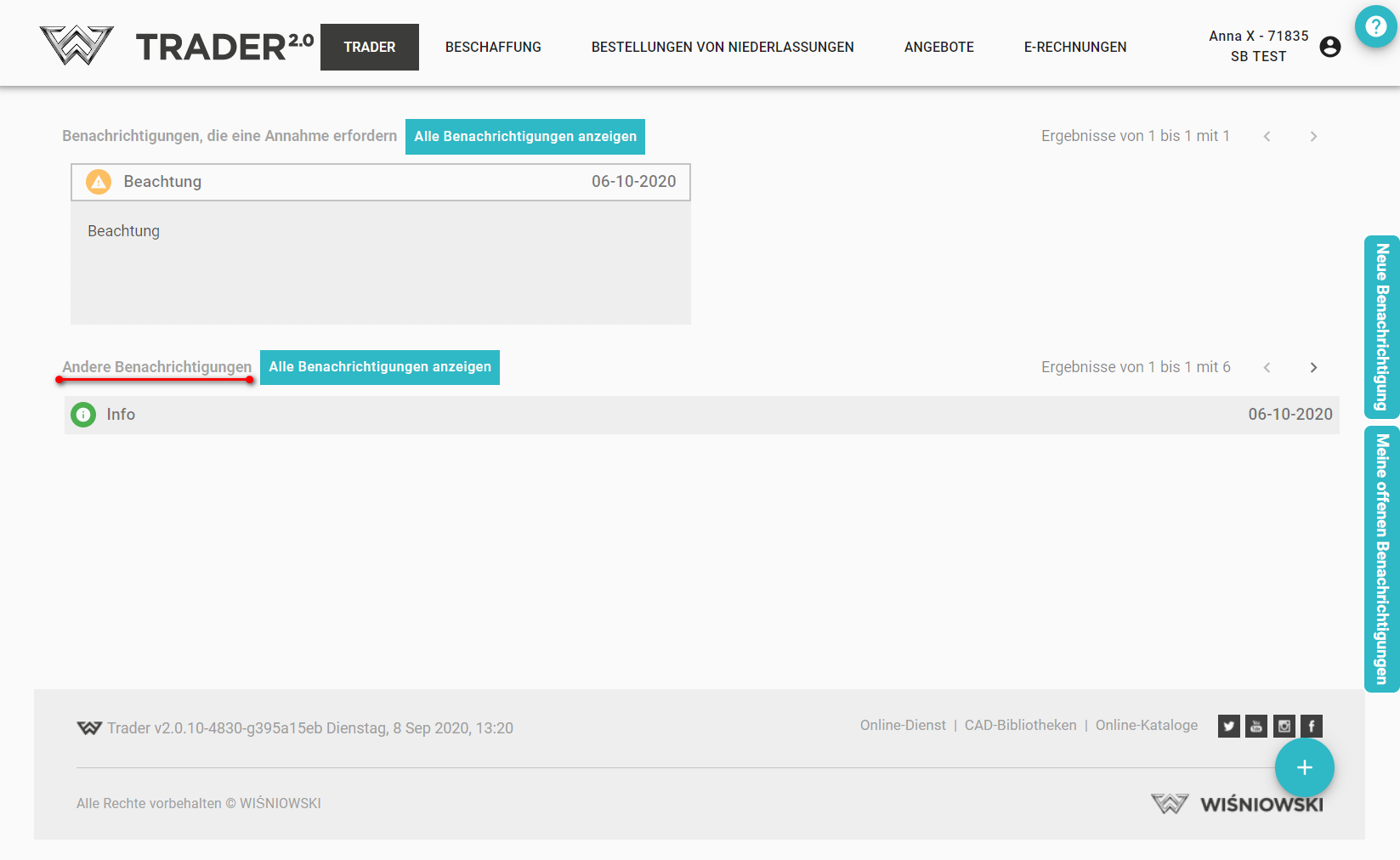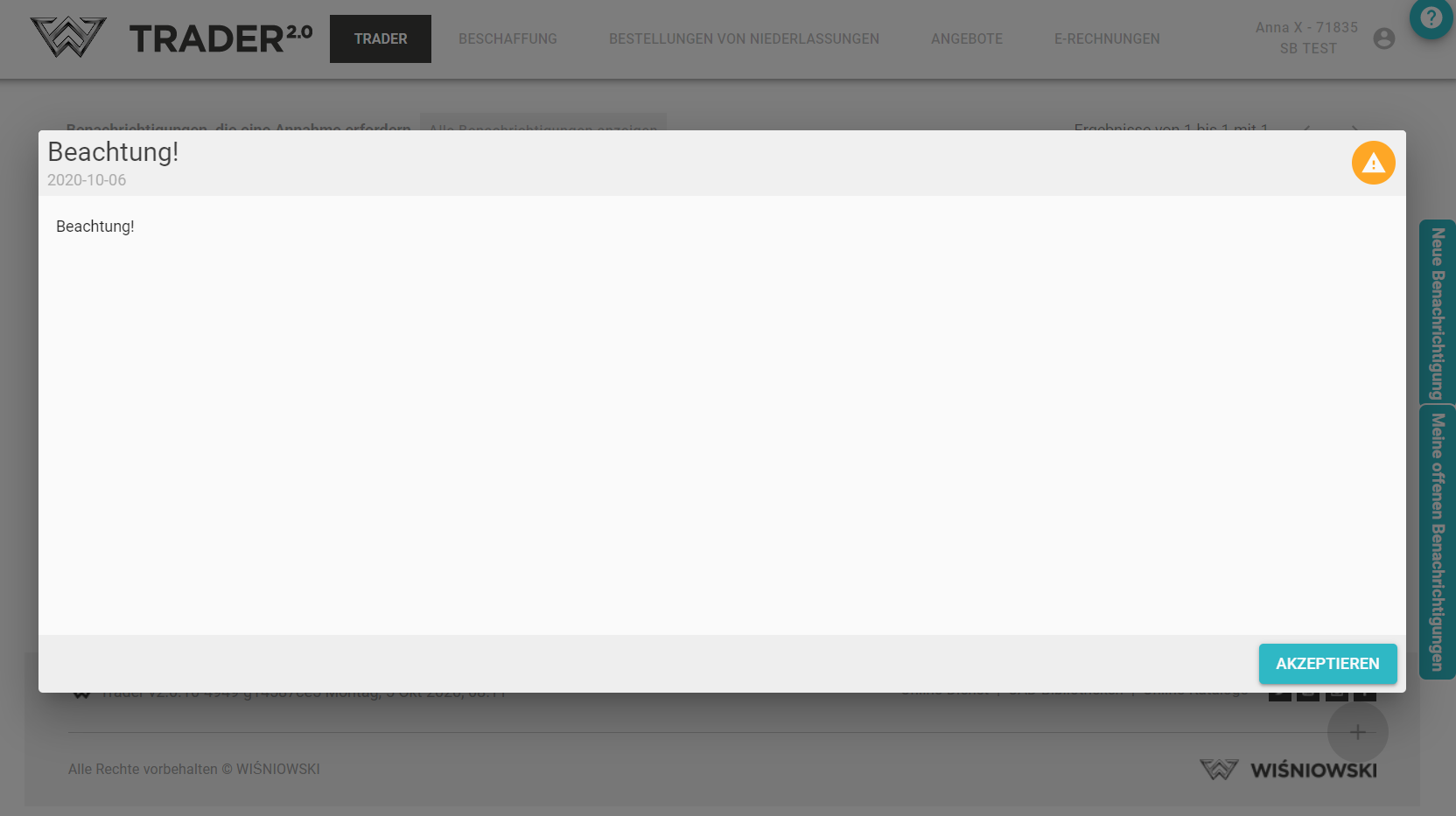 Nachdem Sie sich bei AW TRADER angemeldet haben, werden auf der Homepage Benachrichtigungen angezeigt, die von Fa. Wiśniowski veröffentlicht werden.