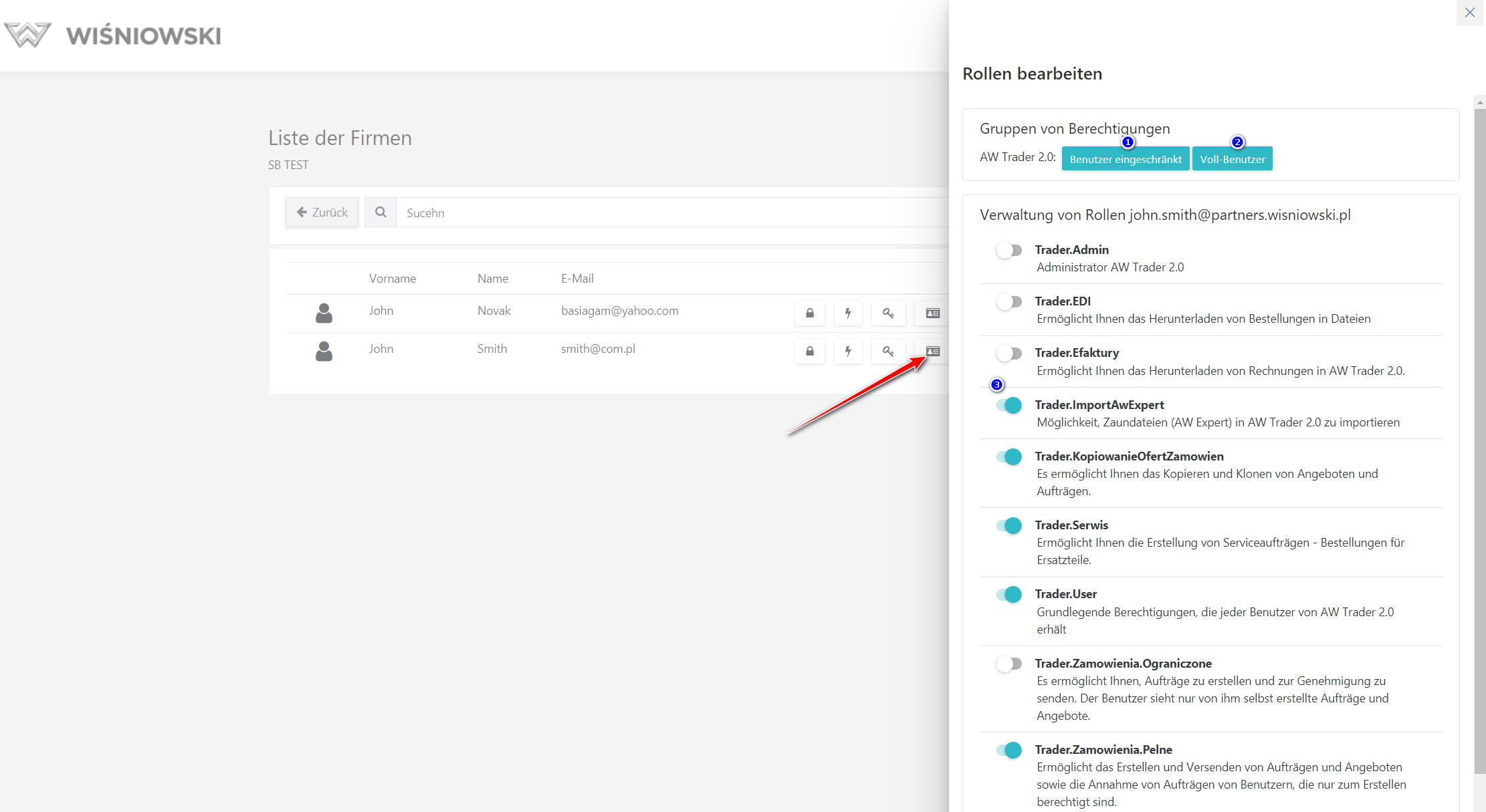 Die Benutzer der AW Trader-Applikation werden vom Administrator jedes Auftragnehmers verwaltet - AW TRADER-Benutzer mit einer zugewiesenen Administrator-Rolle.