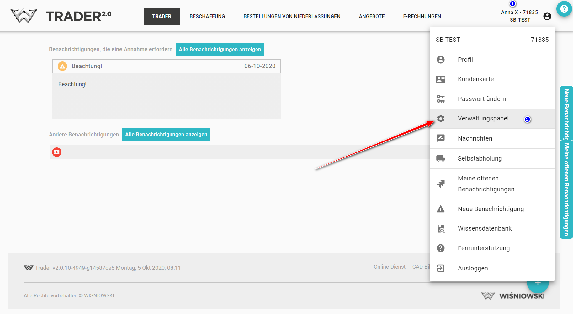 Um zum Verwaltungspanel zu gehen, klicken Sie auf den Benutzernamen (1) und dann auf Verwaltungspanel(2) oder indem Sie die Seite pa.wisniowski.pl benutzen.