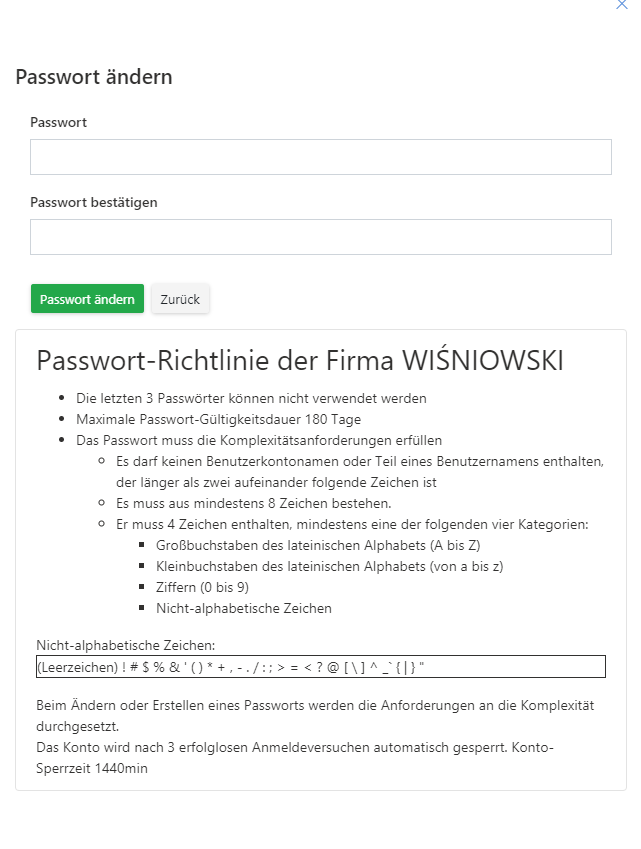 Um das Passwort des ausgewählten Benutzers zu ändern, klicken Sie auf das Symbol und geben Sie ein neues Passwort gemäß der im Passwortänderungsfenster beschriebenen Sicherheitsrichtlinie ein.