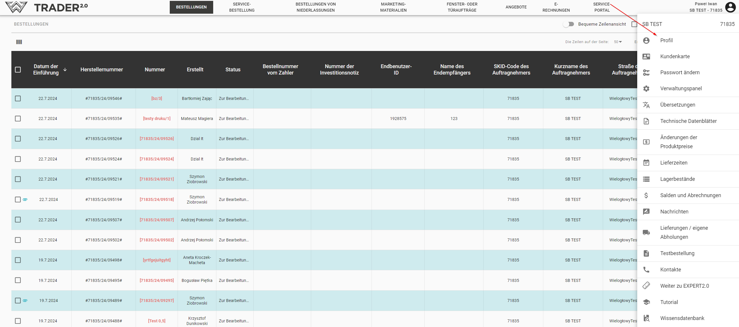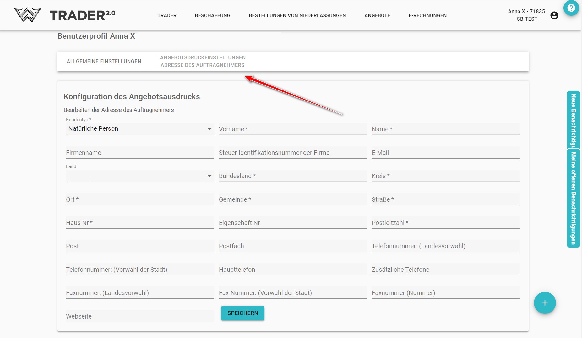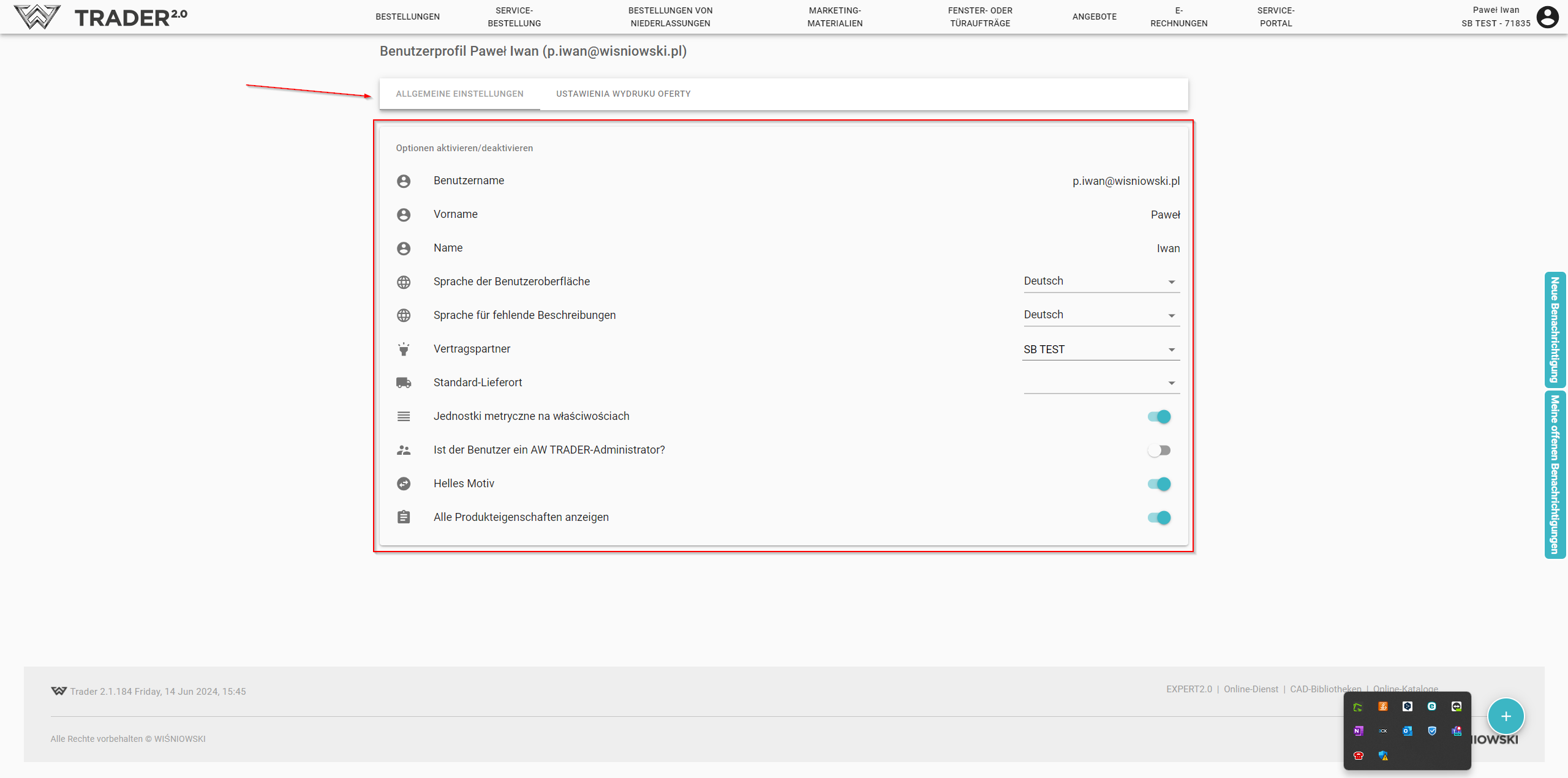 Jeder angemeldete Benutzer hat Zugriff auf die Grundeinstellungen seines Profils und des Angebotsausdrucks.