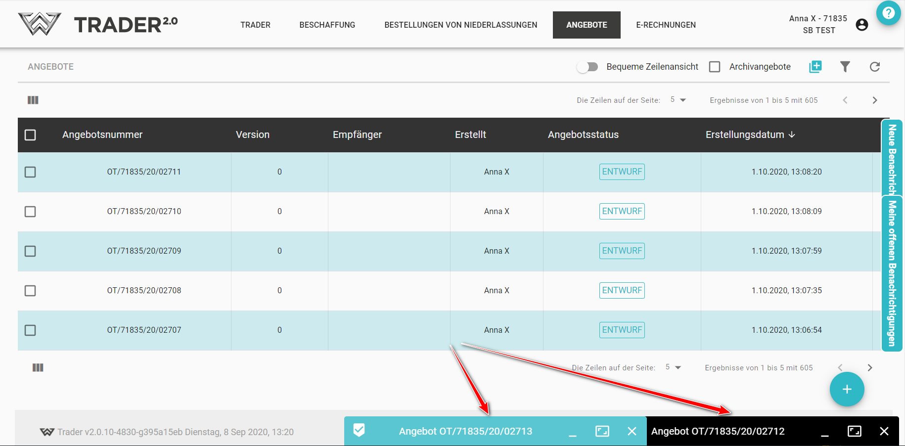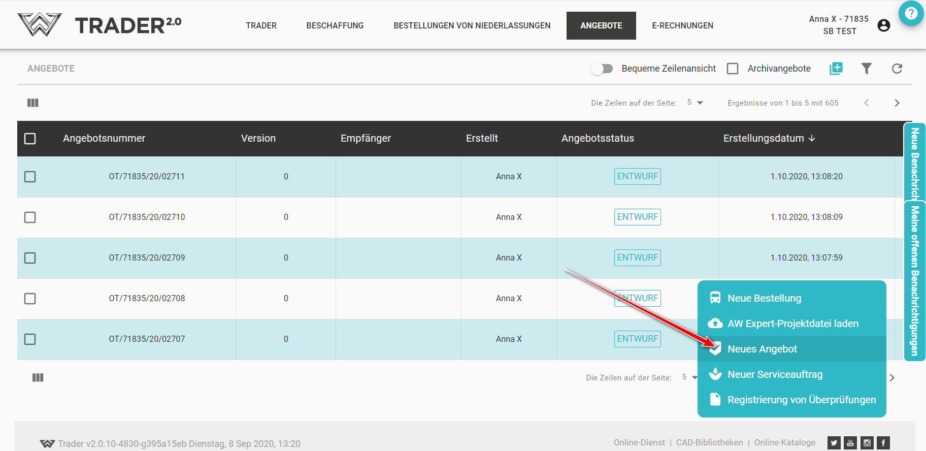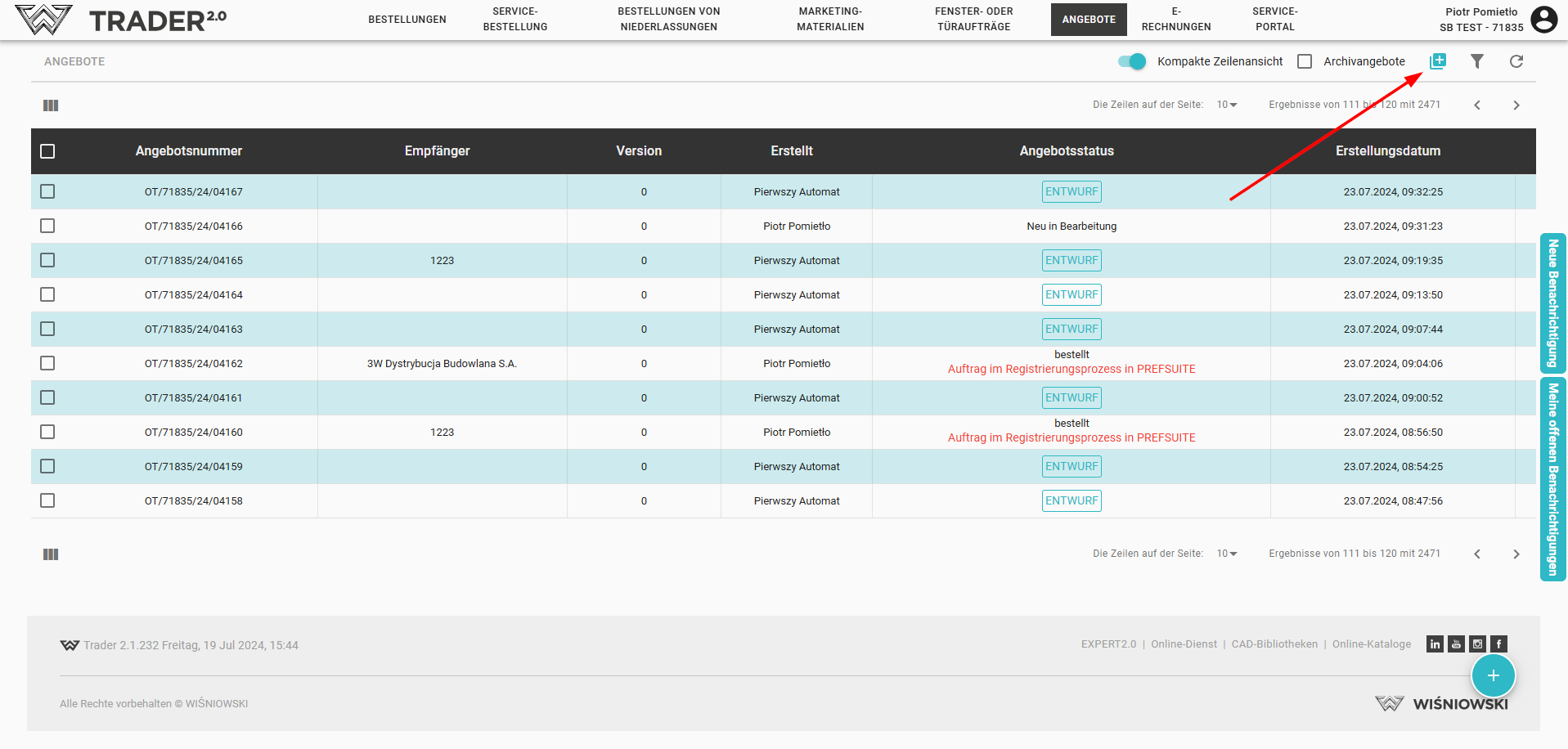 Außerdem ist es möglich, ein neues Angebot zu erstellen, indem Sie auf der Registerkarte ANGEBOTE oben rechts über der Liste der Angebote auf die Taste klicken.