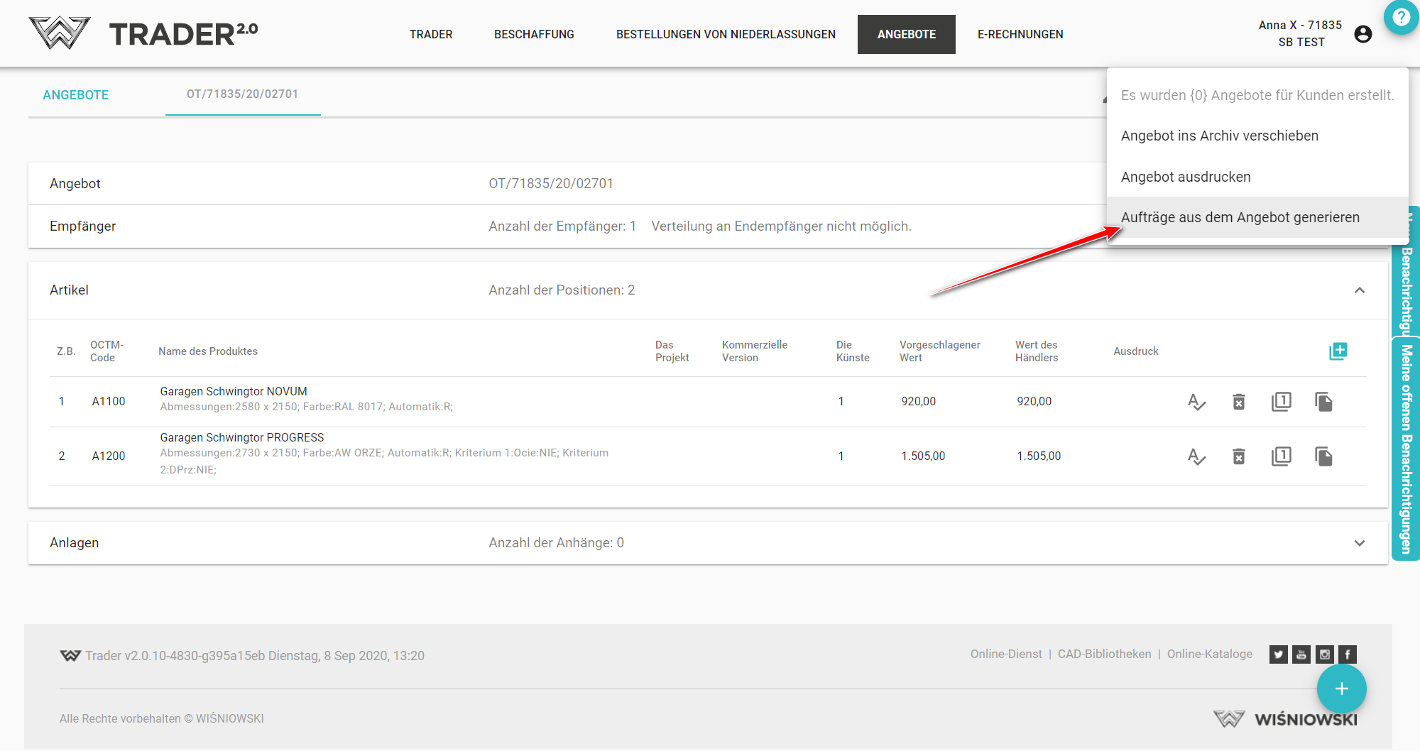 Wählen Sie dann die Option Bestellungen aus dem Angebot generieren