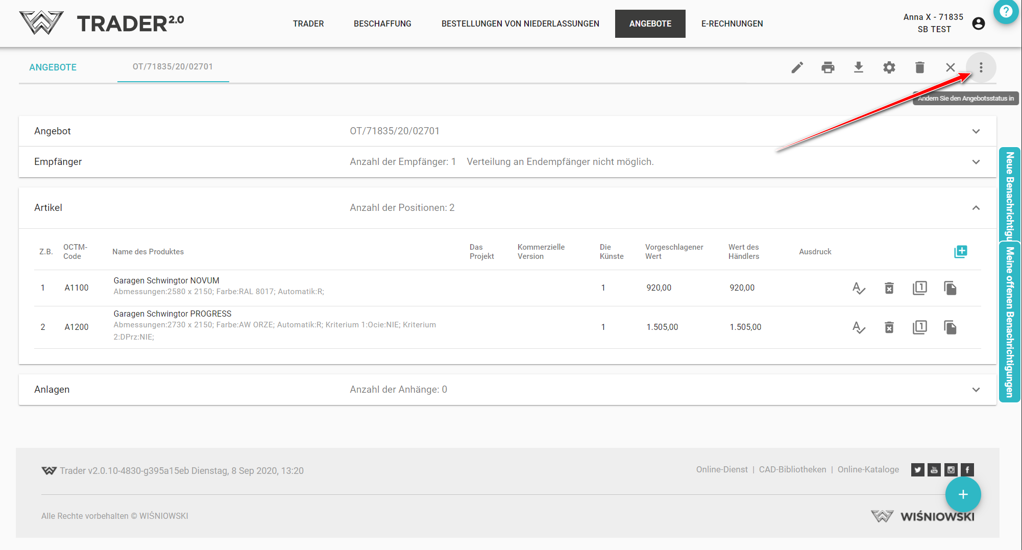 Um eine Bestellung aus einem Angebot zu generieren, öffnen Sie das eingegebene Angebot und klicken Sie oben rechts auf das Symbol für die Statusänderung.