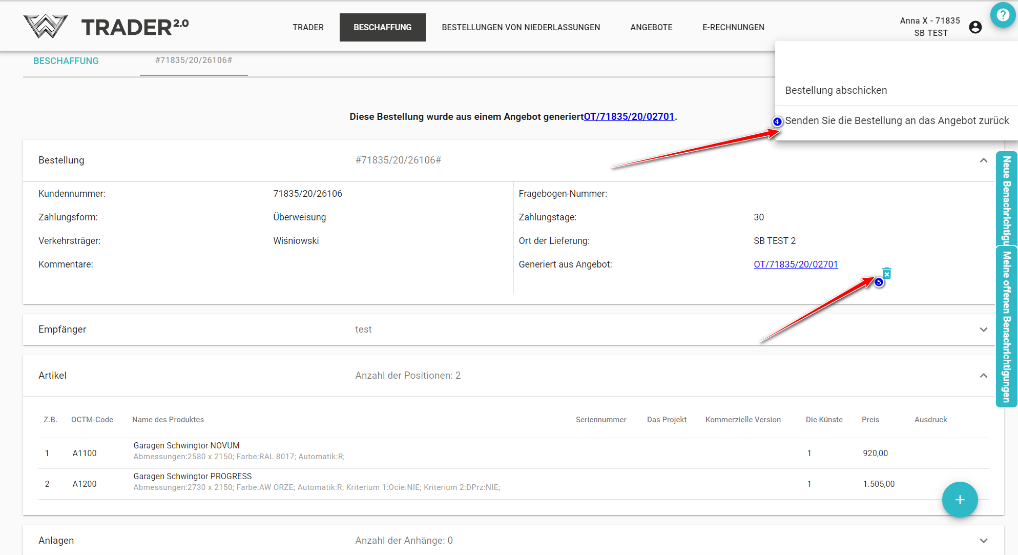 Erstellen einer Bestellung und Zurückführen zum Angebot: