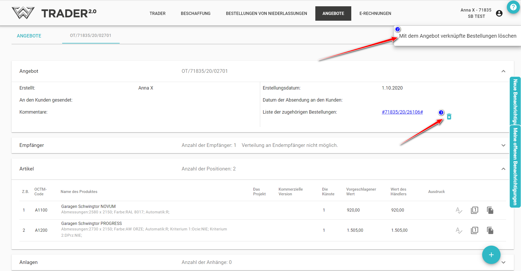 und dann die Option Mit einem Angebot verbundene Bestellungen löschen (2) oder durch Klicken auf das Symbol im Abschnitt 'Angebot' (3).