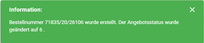 Wenn die Bestellung korrekt erstellt wird, erscheint eine Meldung mit der Bestellnummer.