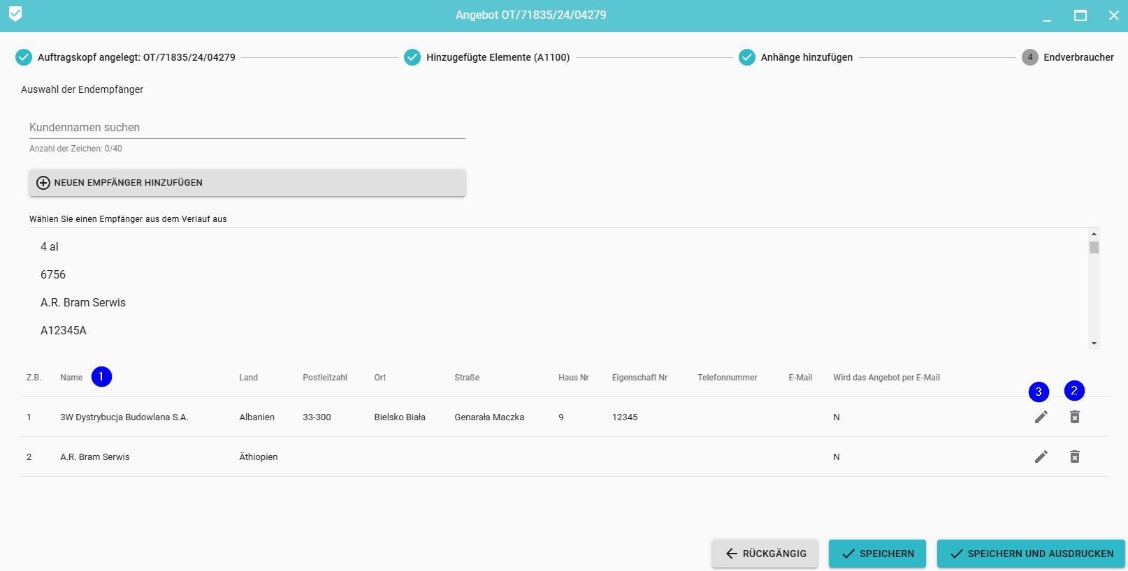 Bei einem Angebot können mehrere Empfänger hinzugefügt werden, die dann in der Liste unterhalb des Auswahlformulars sichtbar sind. (1). Es ist auch möglich, einen hinzugefügten Empfänger zu bearbeiten (3) oder zu löschen (2).