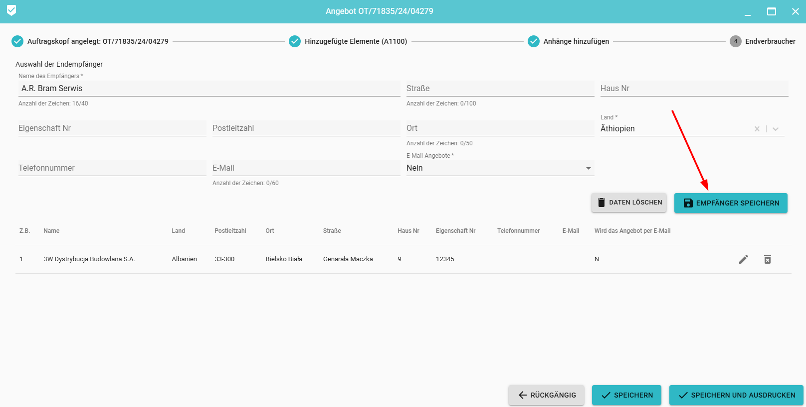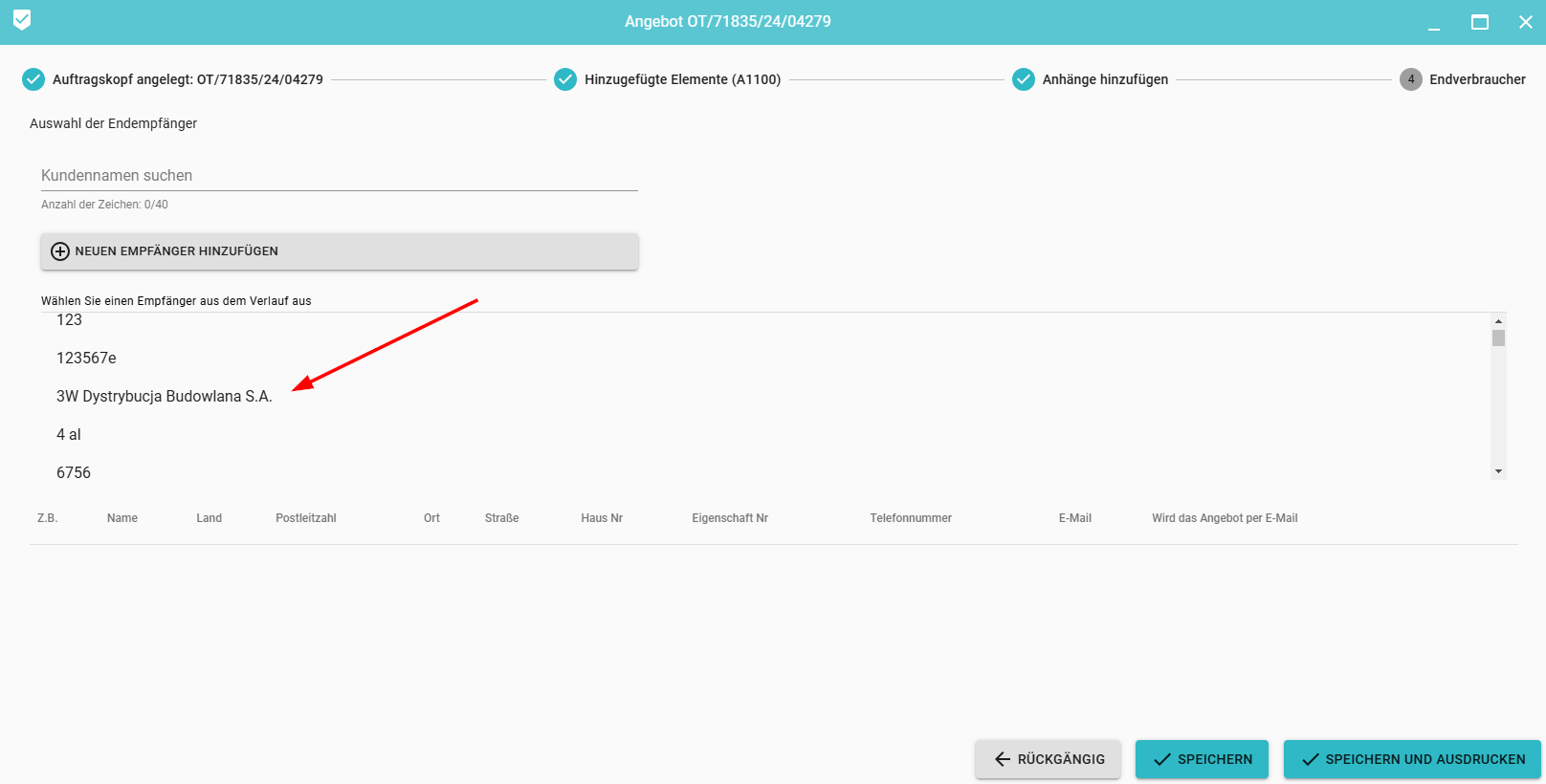 Durch Auswahl eines Empfängers aus der Liste wird dieser automatisch dem Formular hinzugefügt. Schließlich speichern Sie den Empfänger im Angebot, indem Sie klicken.