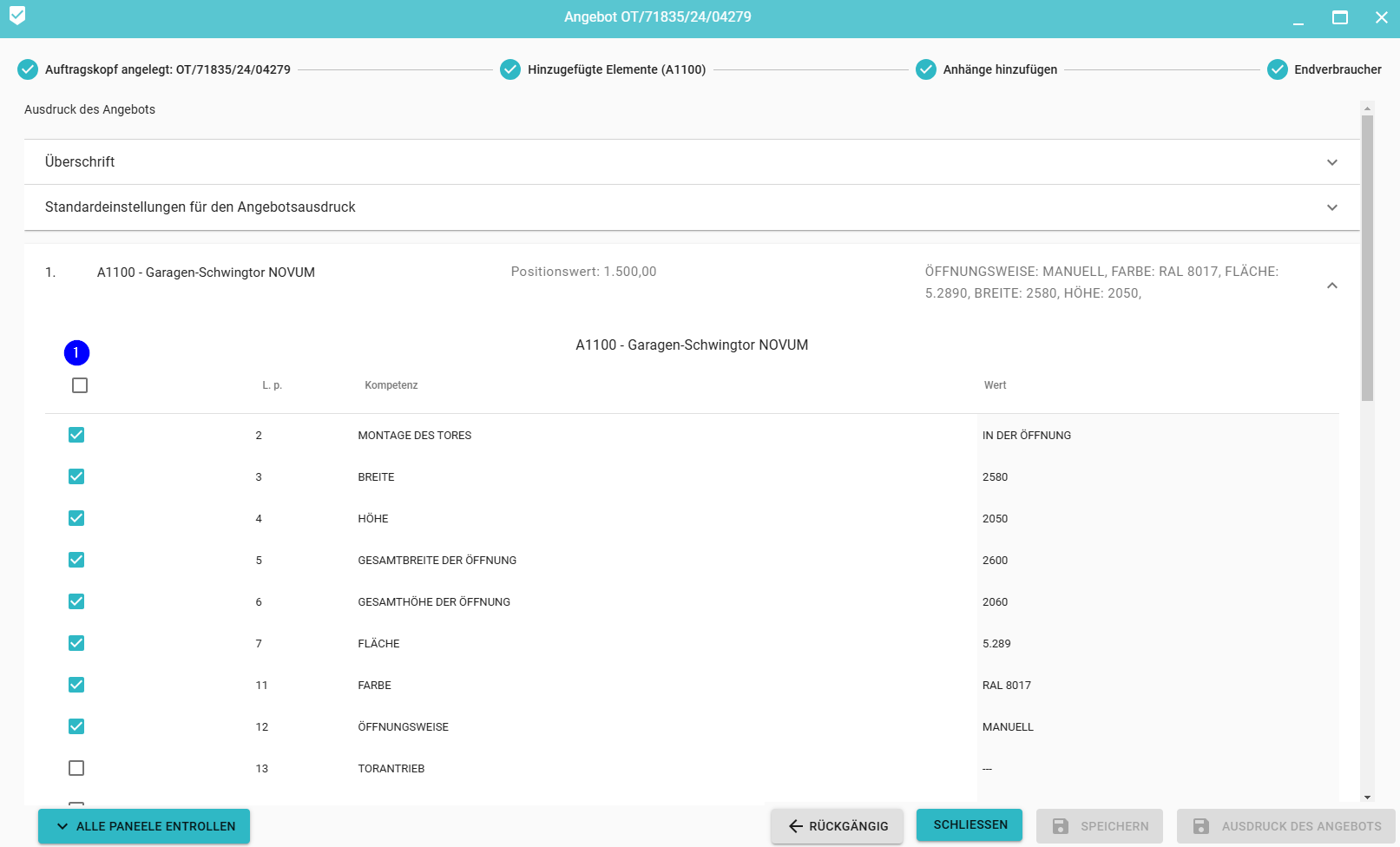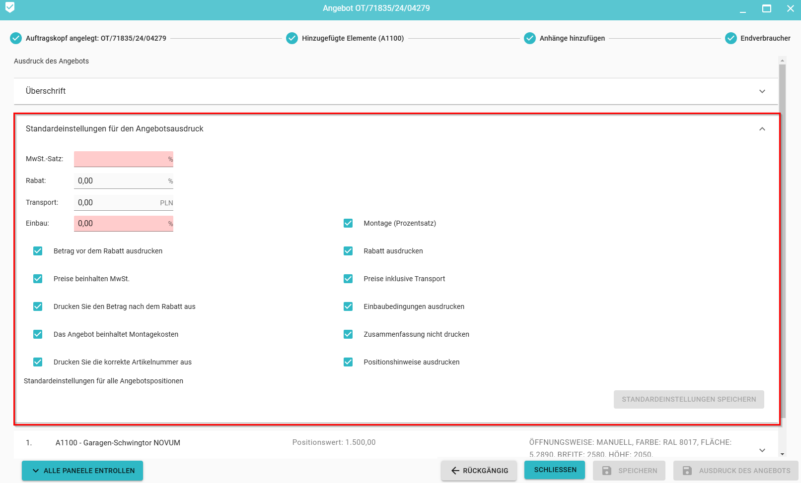 4. Einstellungen für jede Position des Angebots