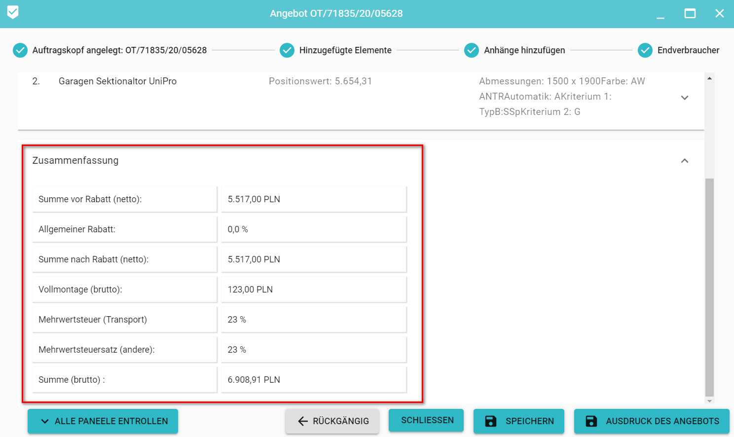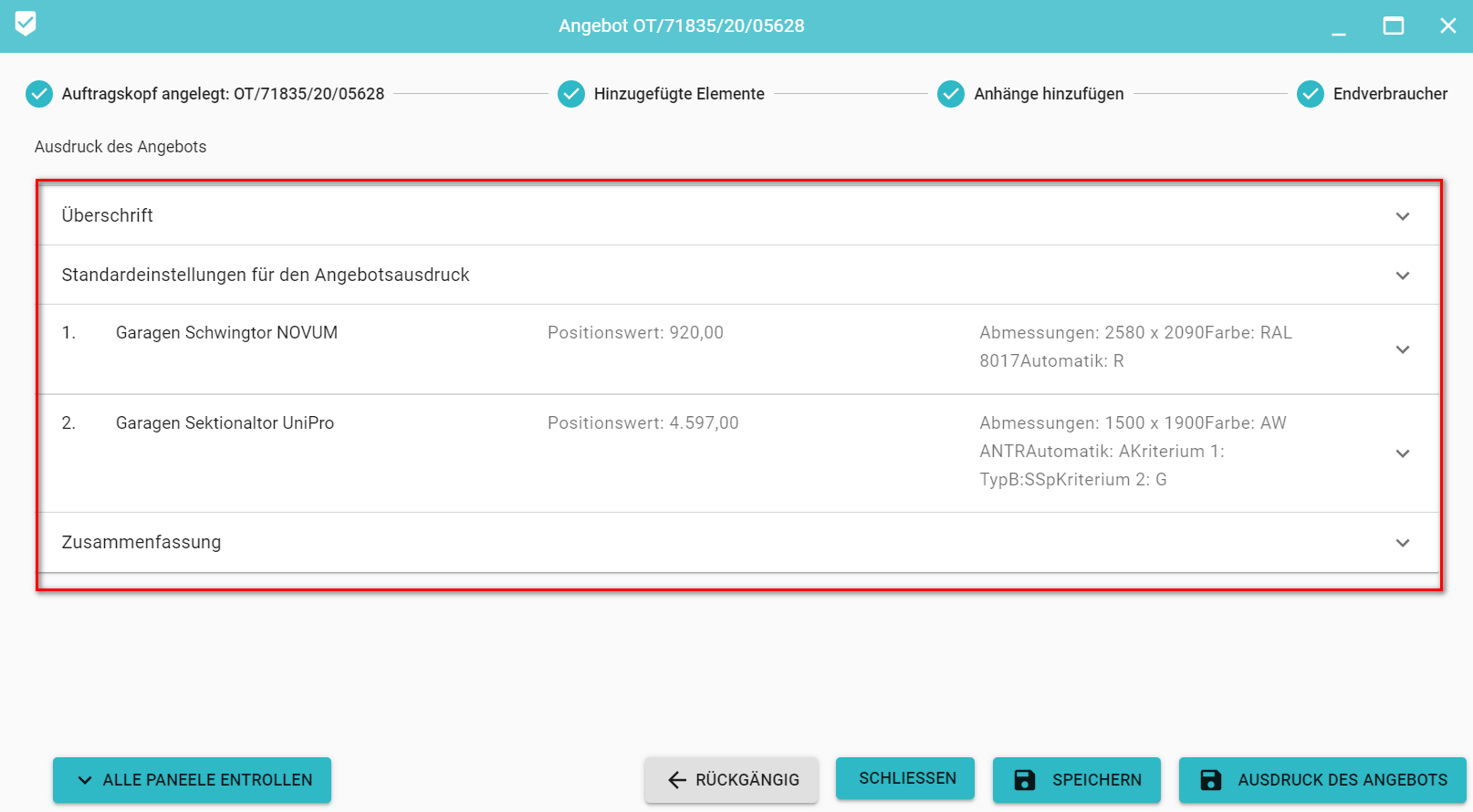 Die Bestimmung der Daten für den Angebotsausdruck besteht aus der Bestimmung der folgenden Elemente: