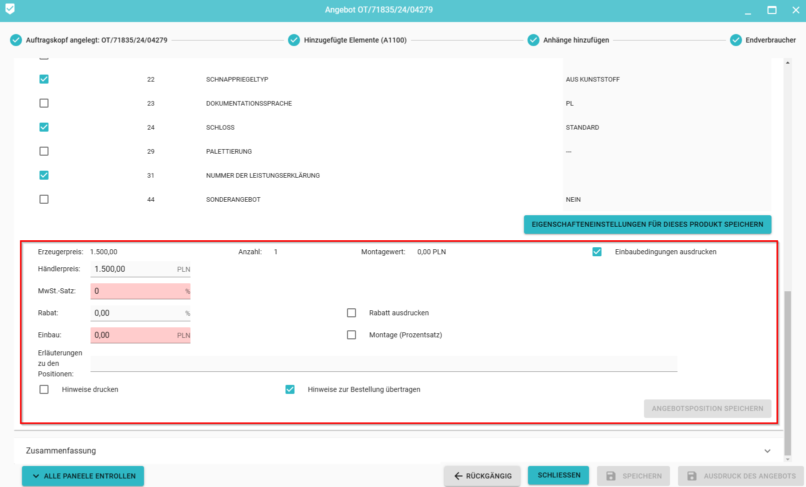5. Einstellung von Preisinformationen, Mehrwertsteuersatz, Rabatt, Montage, Bemerkungen für eine ausgewählte Angebotsposition mit der Information, ob sie auf dem Ausdruck des Angebots als separates Element der Zusammenfassung erscheinen soll und ob für die gegebene Position Baukonditionen ausgedruckt werden sollen (falls vorhanden). Darüber hinaus kann angegeben werden, ob die Positionsnotizen in die Bestellung übernommen werden sollen.