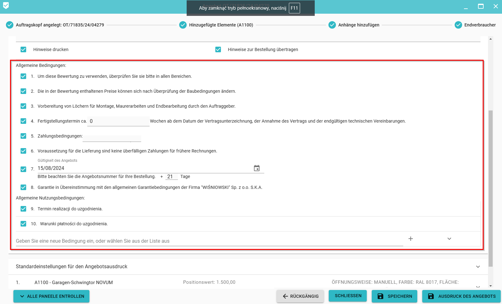 Nur die ausgewählten Konditionen werden auf dem Angebotsausdruck angezeigt. Relevante Konditionen müssen zusätzlich ergänzt werden (Abschlussdatum, Zahlungsbedingungen und Angebotsgültigkeit).