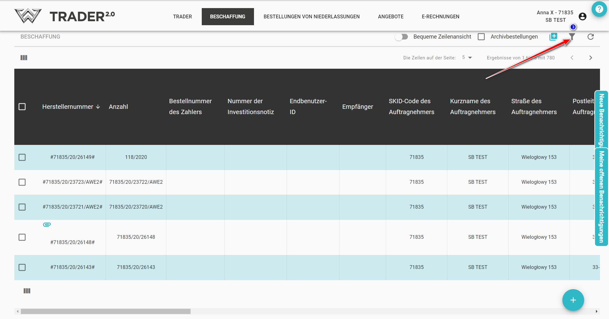 Um mehrere Aufträge mit bestimmten Parametern zu filtern, klicken Sie auf das Symbol in der rechten oberen Ecke der Auftragsliste (3).