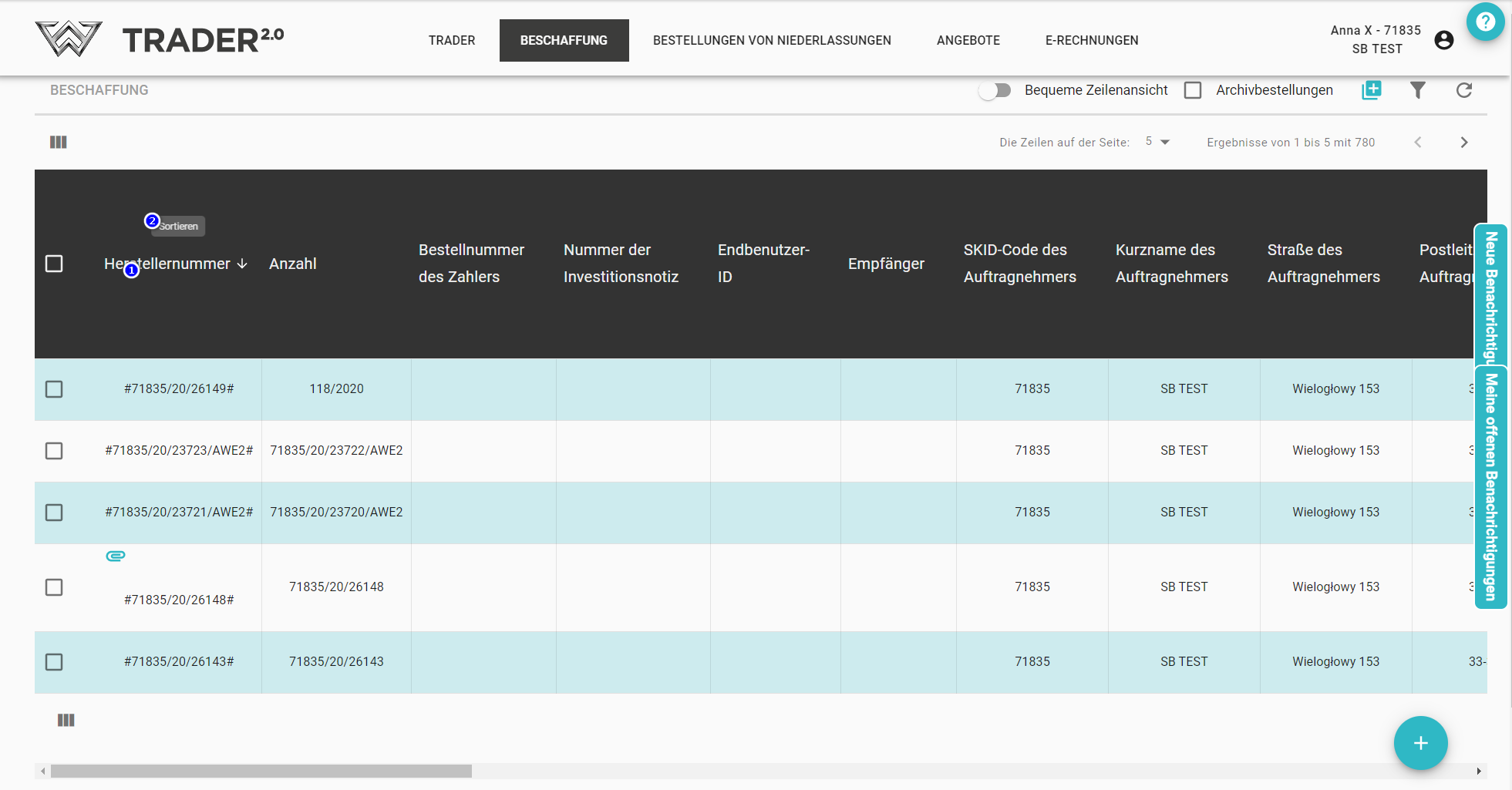 Die angezeigte Liste der Aufträge oder Angebote kann nach jeder beliebigen Spalte sortiert werden. Fahren Sie einfach mit der Maus über die Überschrift einer bestimmten Spalte (1) (dann erscheint der Tooltip Sortieren (2)) und klicken Sie auf den Spaltennamen. Die Sortierung nach der angegebenen Spalte erfolgt automatisch.