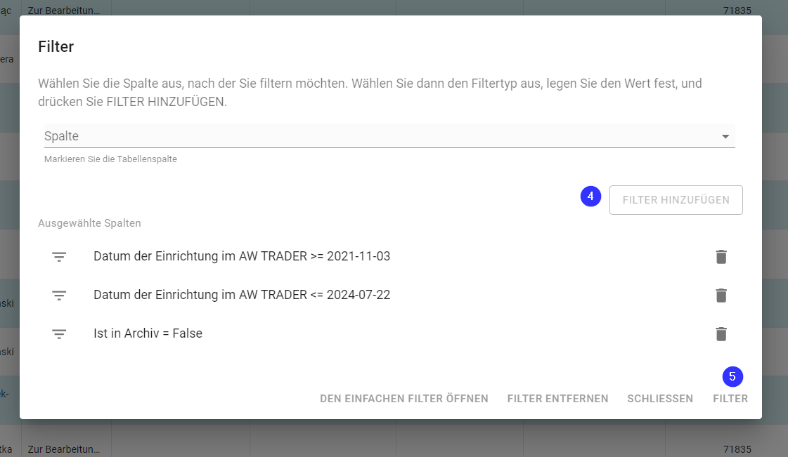 Den Filter aktivieren Sie durch Klicken auf Filter hinzufügen(4) und dann Filtern(5).