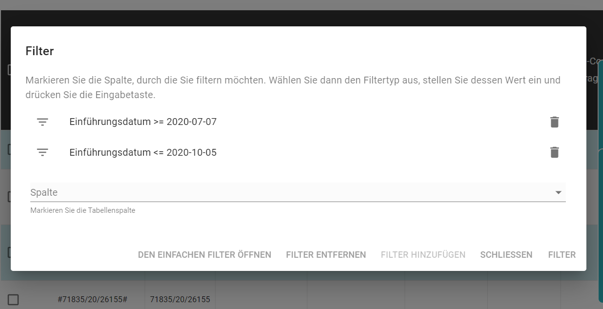 Der erweiterte Filter ermöglicht es Ihnen, durch die ausgewählte Spalte zu filtern.