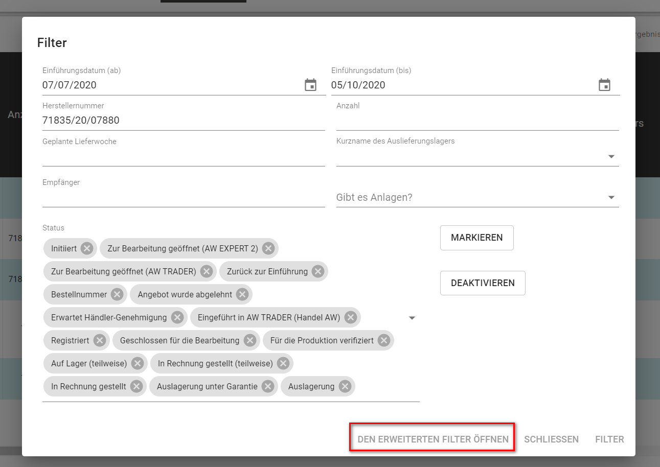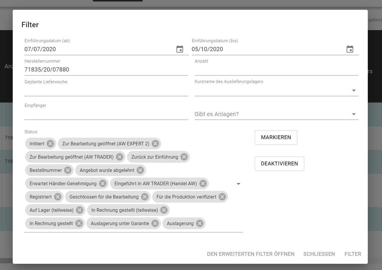 dem Auftragsstatus (Option Alle Status aktivieren/deaktivieren oder aus der Liste auswählen)
