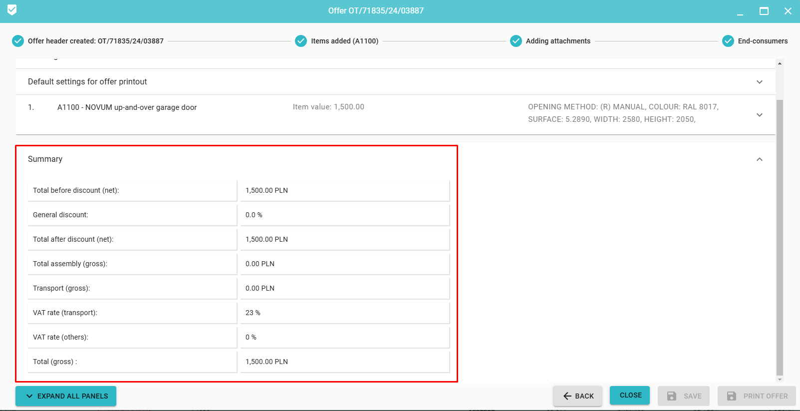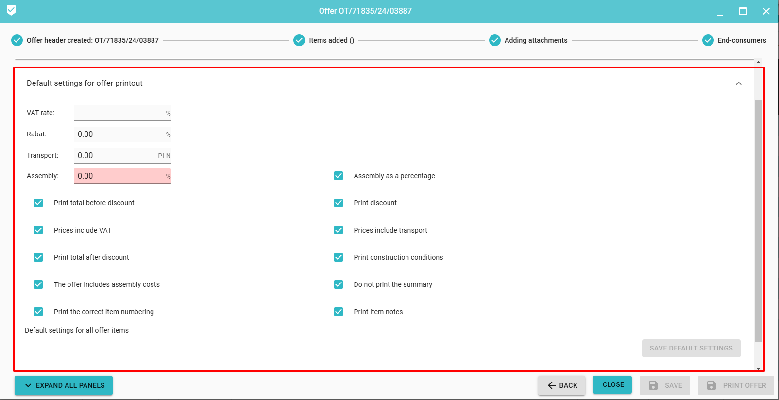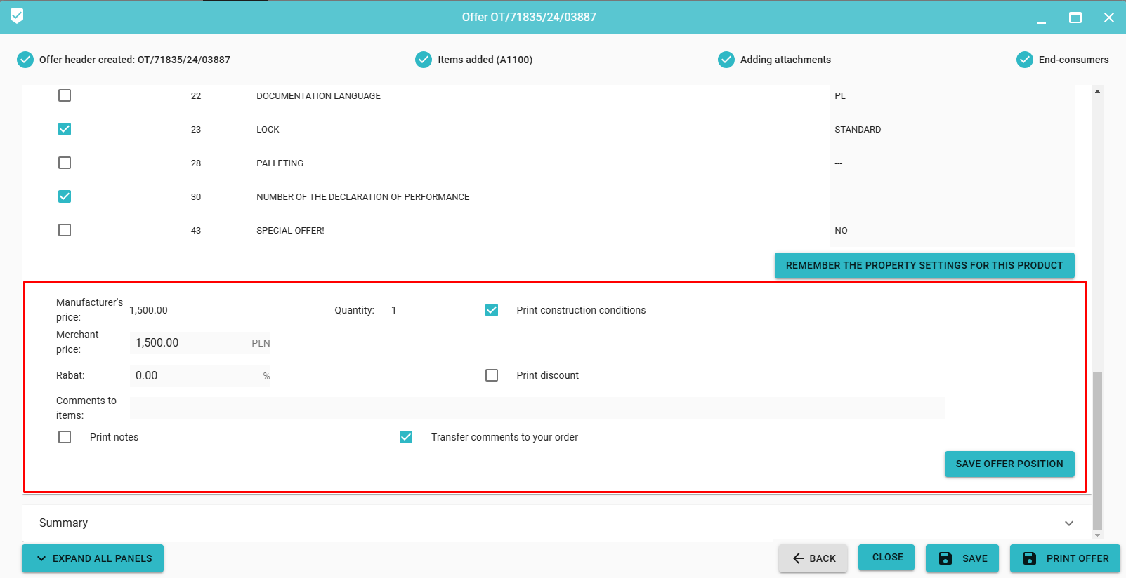 5. Setting price information, VAT rate, discount, assembly, remarks for a selected offer item with information whether it is to appear on the printout of the offer as a separate element of the summary, and whether building conditions are to be printed for the given item (if available). In addition, it is possible to indicate whether the item notes are to be transferred to the order