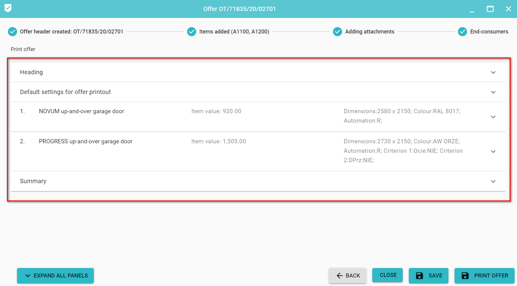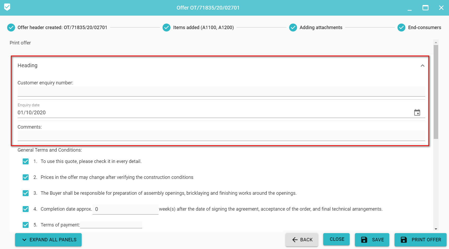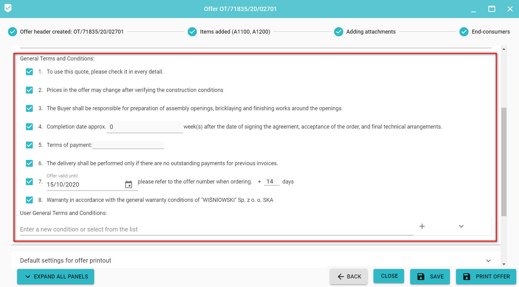 Only selected conditions will be displayed on the offer printout. The relevant conditions require additional supplementation (completion date, payment terms and offer validity).