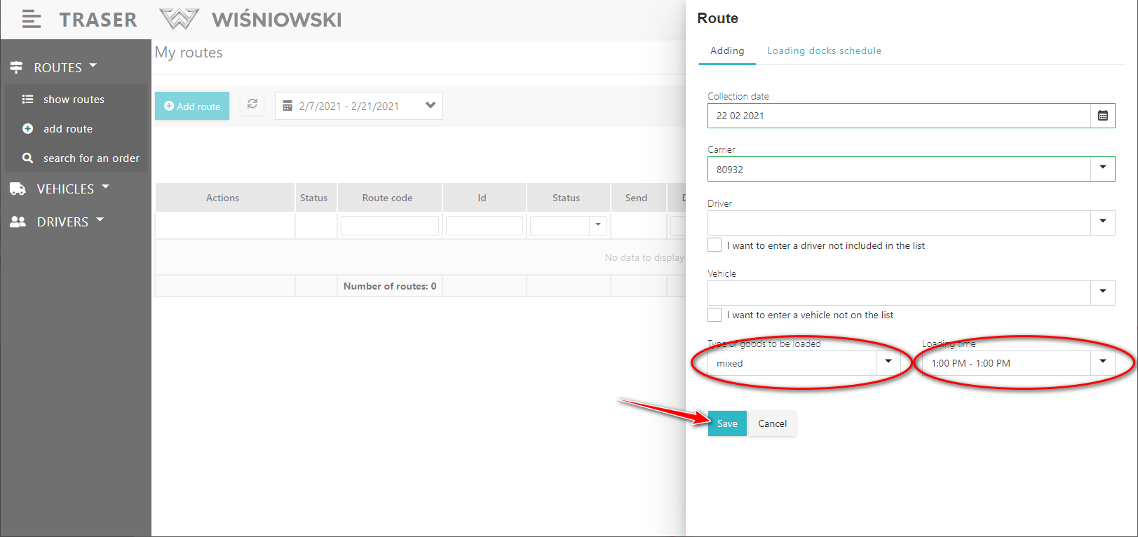 1. Select in the side menu: Routes → show routes. A list of Routes should be displayed. Click the "Add route" button (Fig. 6.). Then proceed as in Fig. 2. and Fig. 4.