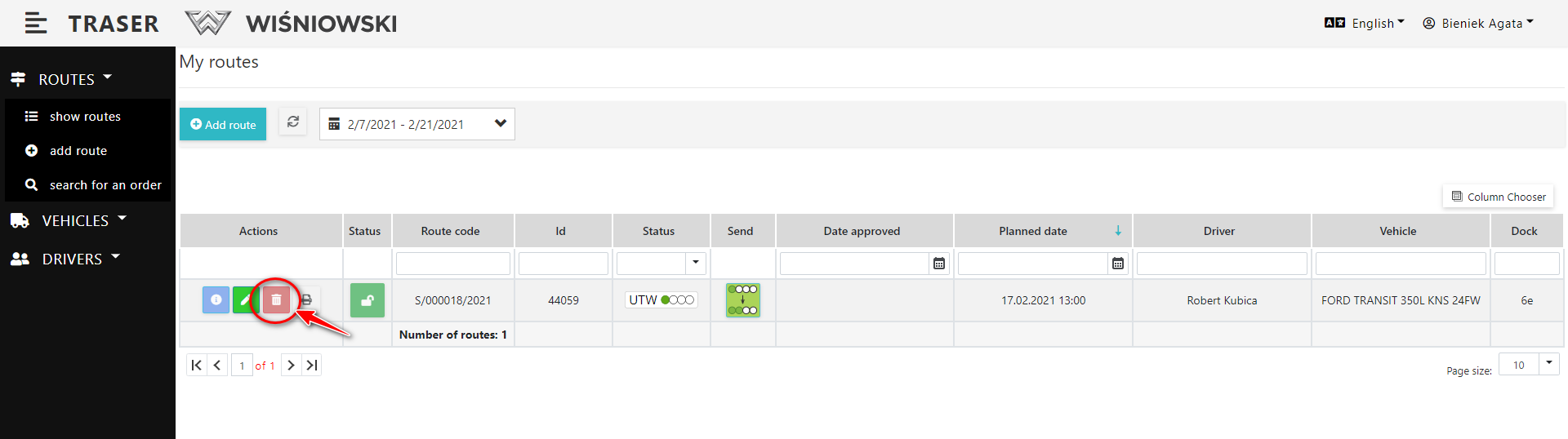 1. To delete a Route, click the red button with a trash can icon next to the appropriate Route (Fig. 3), and then confirm the deletion by clicking the "DELETE" button.