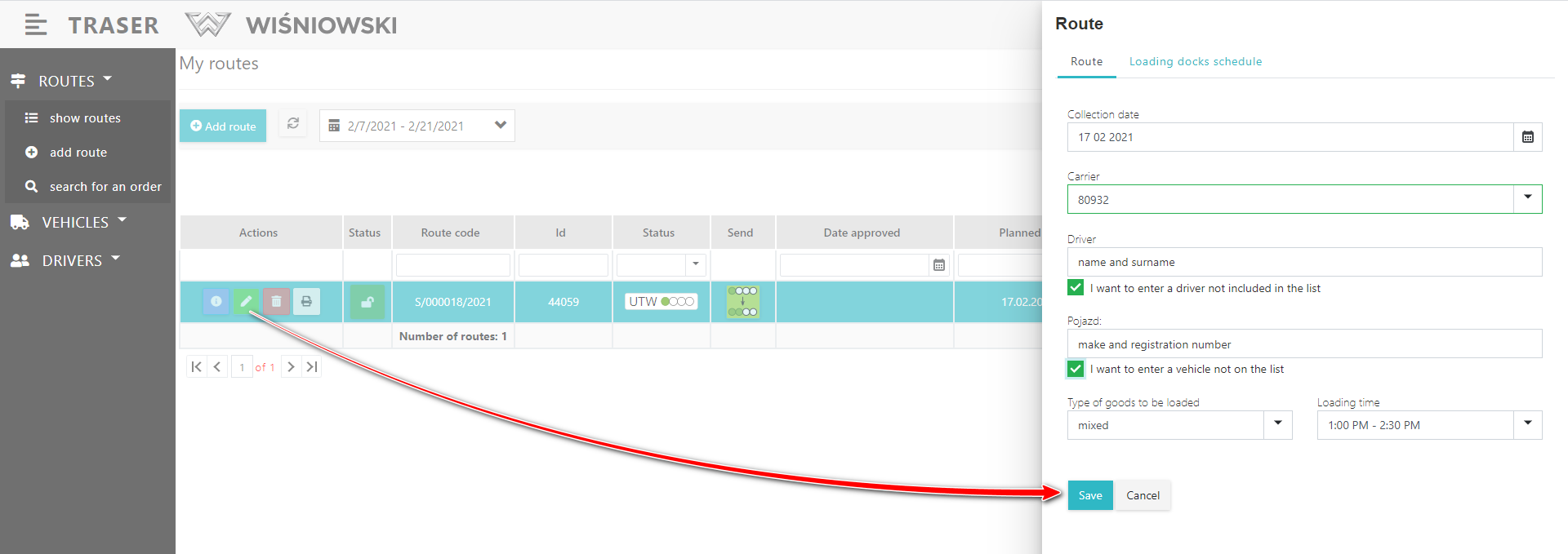2. Edit the Route on the side panel and click the "SAVE" button (Fig. 2.).