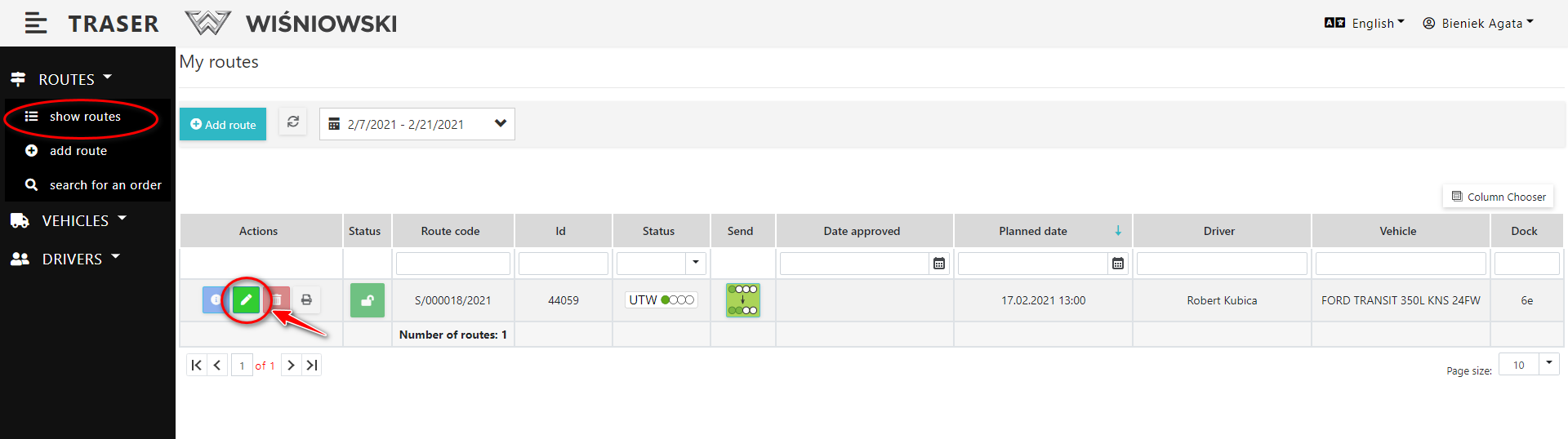 Click the green button with a pencil icon next to the appropriate Route. (Fig. 1.)..