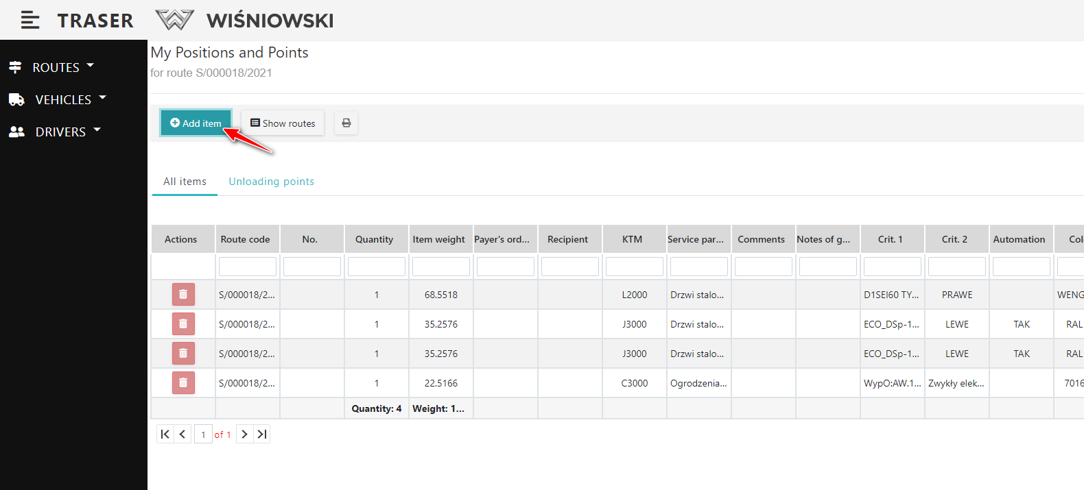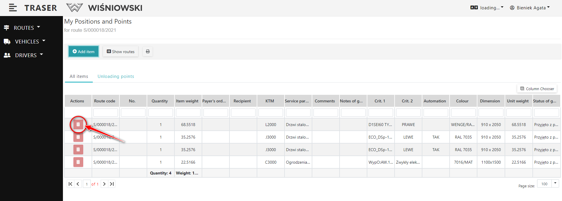 1. Go to the Route details (Fig. 1.) and click the red button with a trash can icon next to the selected Item (Fig. 4.). Then confirm by clicking the "DELETE" button.