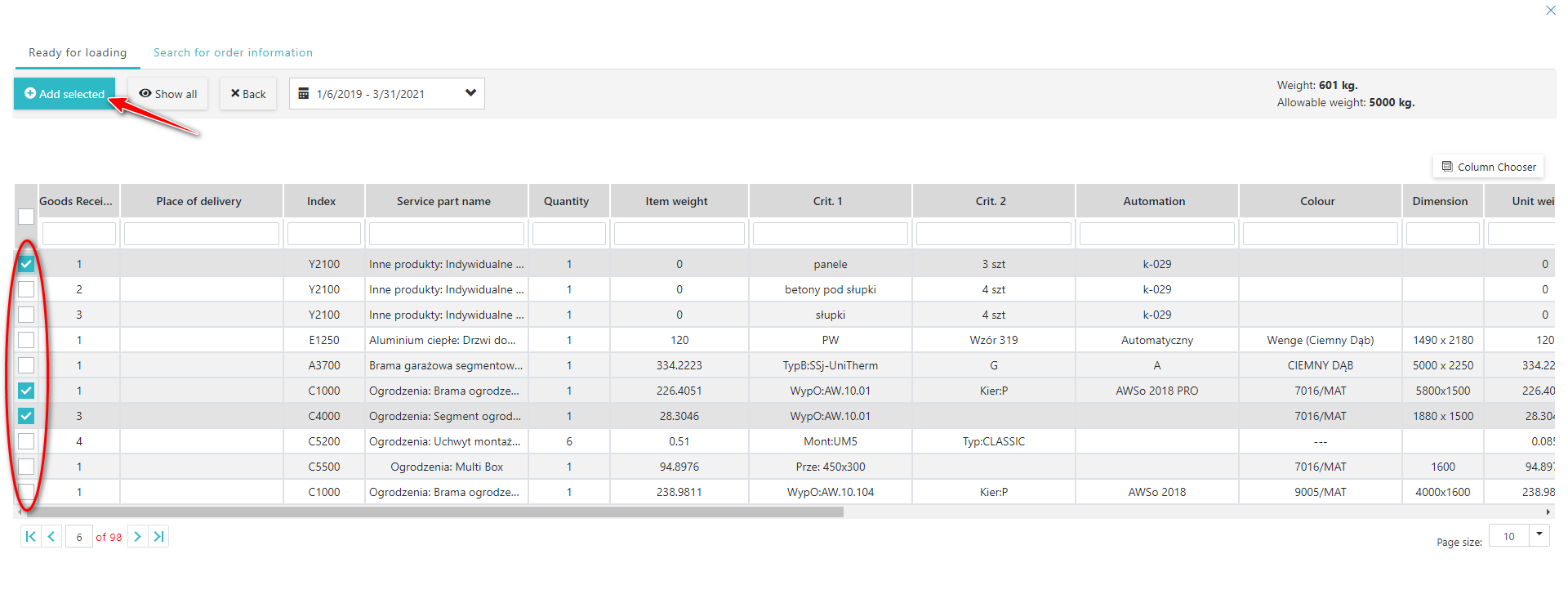 3. Select from the list the Items you want to add by checking them in the first column. Then click "Add selected" (Fig. 3.).
