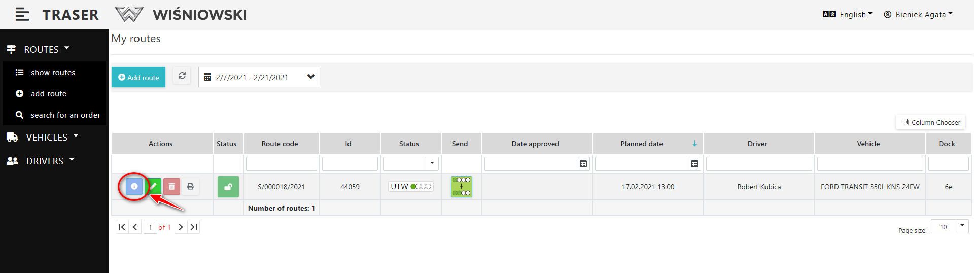 1. Select in the side menu: Routes → show routes. A list of Routes should be displayed. Click the blue button with an information icon next to the appropriate Route (Fig. 1.).