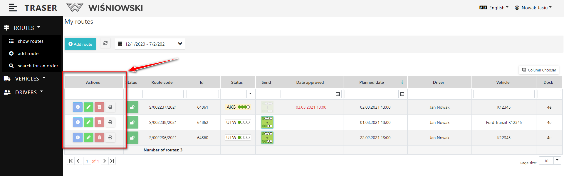Route editing/removing is blocked one day before the pickup date, provided that the route has been approved by the Transport Department.