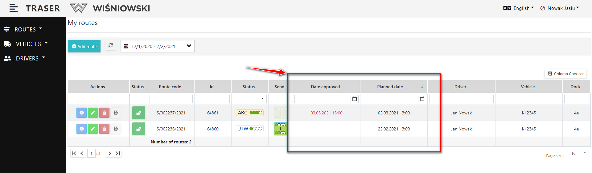 The Transport Department must approve the date and time of collection when accepting the route (AKC status). The date / time confirmed by the Transport Department appears in the column "Date approved" (Fig.1).
