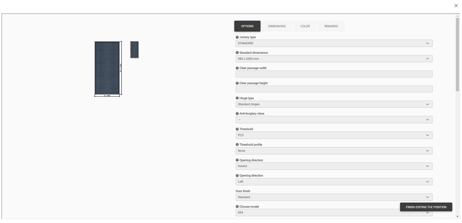 A new window will appear where we can set the available properties. It is divided into 4 tabs (OPTIONS, DIMENSIONS, COLOR, NOTES).