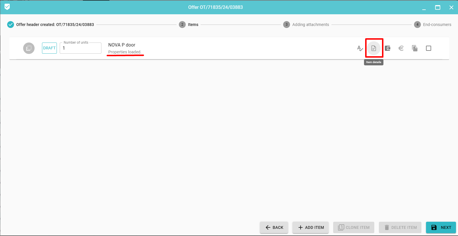 After selecting the product we are interested in, we can move on to determining its properties. After loading the product properties, we click on the item or on the Item Details icon.
