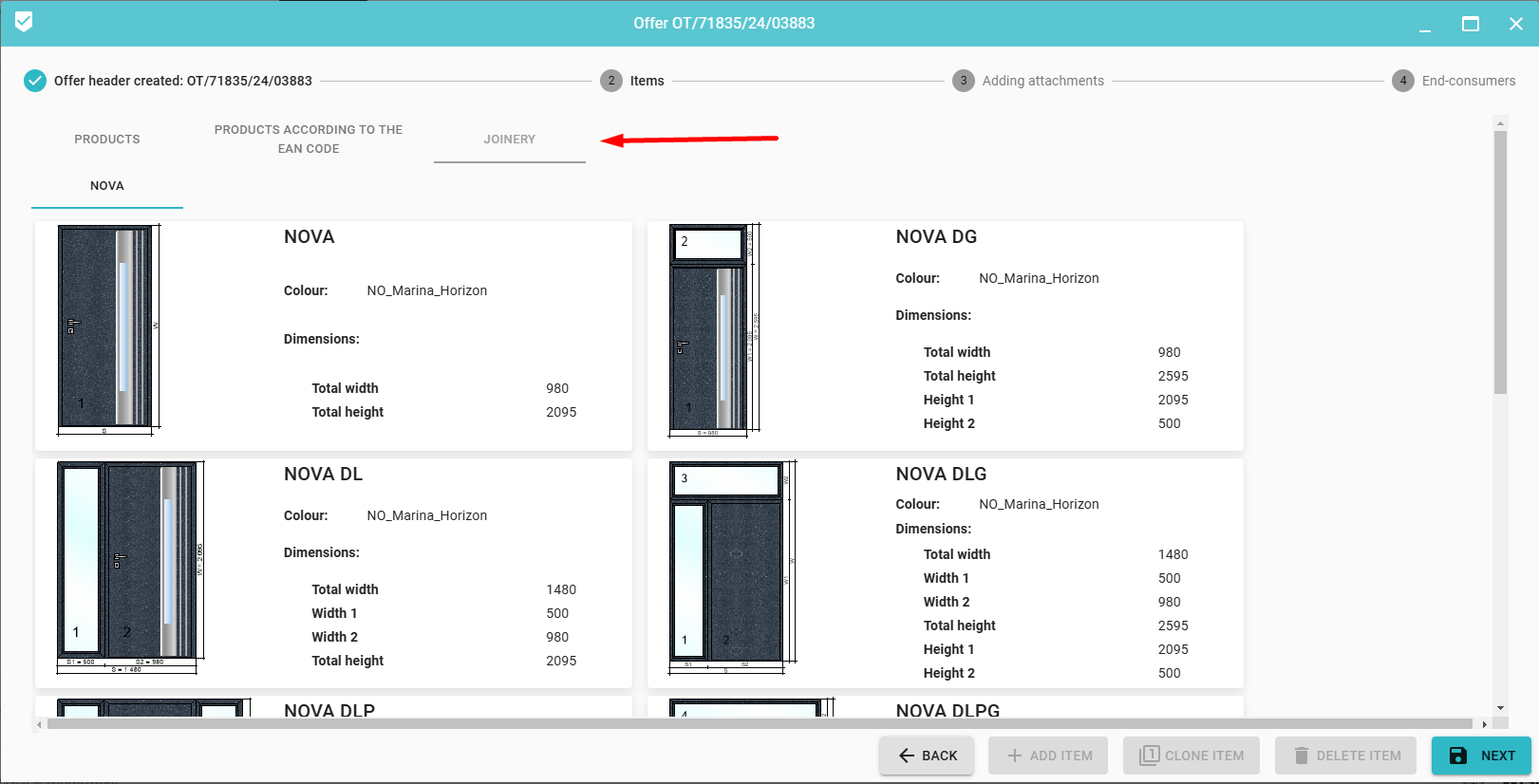 In the items section, we will see an additional tab JOINERY - you will find the available products divided into groups: