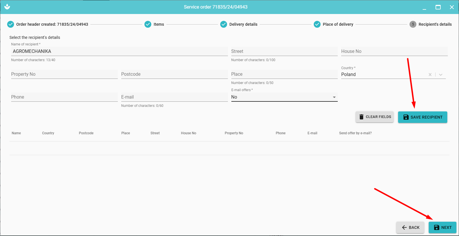 In the last step, we can select or add recipient details and delivery details (operation analogous to Stage 5 - Recipient details).