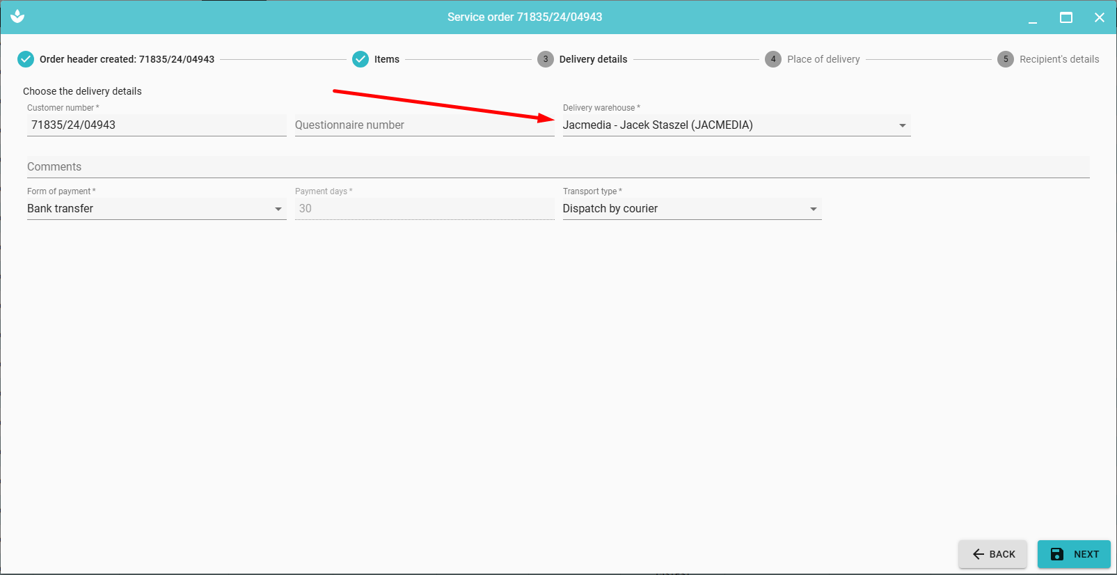 In the next step, we can select Delivery details (operation analogous to the tab Order delivery details).